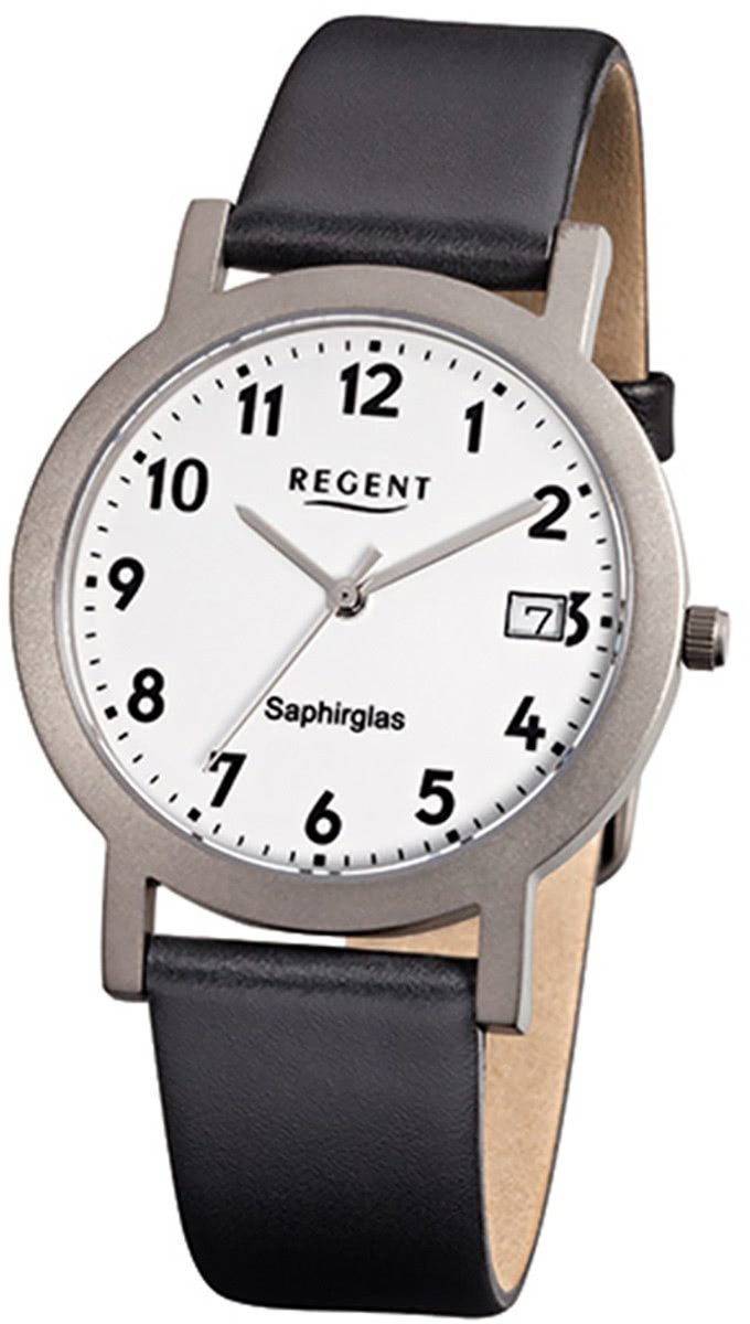 Die Elegant Uhr der Marke Regent hat ein schönes Armband aus Leder in schwarz mit Dornschließe. Eine Uhr aus der Regent Titan-Uhren Kollektion für Herren in der Gehäusefarbe silber grau mit Quarzwerk. Die Analoguhr mit Saphirglas hat ein Zifferblatt in der Farbe weiß. Die Form der Uhr ist rund und das Gehäuse ist mittel ca. 37mm.