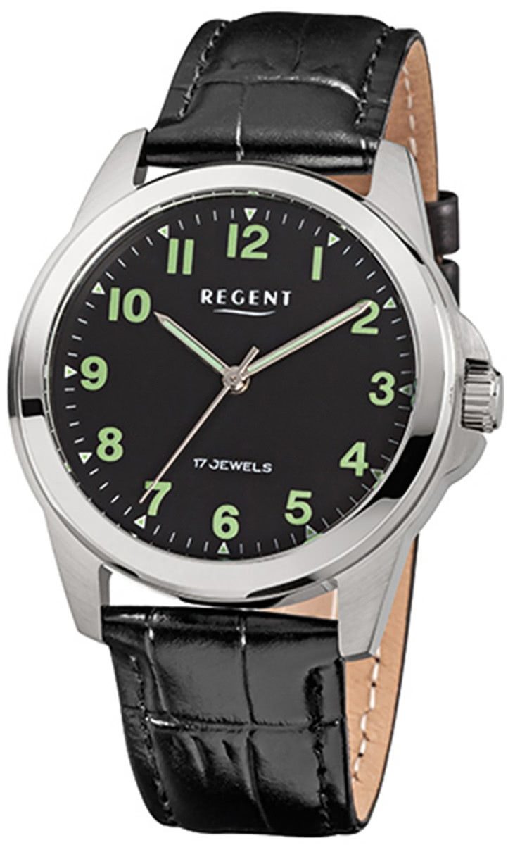 Die Elegant Uhr der Marke Regent hat ein schönes Armband aus Leder in schwarz mit Dornschließe. Eine Uhr aus der Regent Handaufzuguhren Kollektion für Herren in der Gehäusefarbe silber mit Handaufzug. Die Analoguhr mit Mineralglas hat ein Zifferblatt in der Farbe schwarz. Die Form der Uhr ist rund und das Gehäuse ist mittel ca. 39mm.