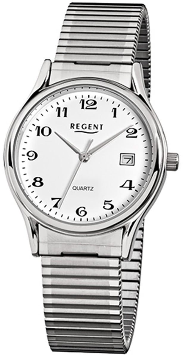Die Elegant Uhr der Marke Regent hat ein schönes Armband aus Edelstahl in silber mit Zugband. Eine Uhr aus der Regent Zugarmband Kollektion für Herren in der Gehäusefarbe silber mit Quarzwerk. Die Analoguhr mit Mineralglas hat ein Zifferblatt in der Farbe weiß. Die Form der Uhr ist rund und das Gehäuse ist mittel ca. 36mm.