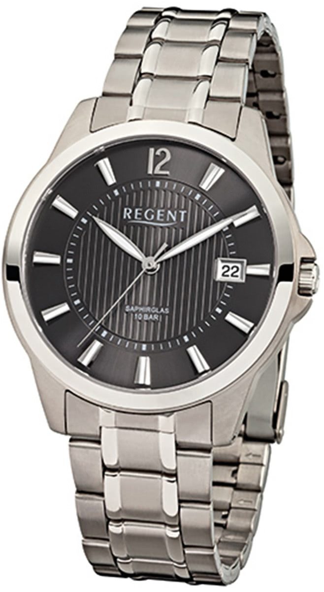 Die Elegant Uhr der Marke Regent hat ein schönes Armband aus Titan in silber mit Faltschließe. Eine Uhr aus der Regent Titan-Uhren Kollektion für Herren in der Gehäusefarbe silber mit Quarzwerk. Die Analoguhr mit Saphirglas hat ein Zifferblatt in der Farbe schwarz. Die Form der Uhr ist rund und das Gehäuse ist mittel ca. 39mm.