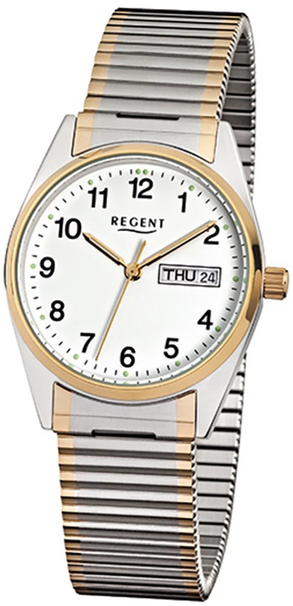 Die Elegant Uhr der Marke Regent hat ein schönes Armband aus Edelstahl ionenplattiert gold in silber gold mit Zugband. Eine Uhr aus der Regent Zugarmband Kollektion für Herren in der Gehäusefarbe silber gold mit Quarzwerk. Die Analoguhr mit Mineralglas hat ein Zifferblatt in der Farbe weiß. Die Form der Uhr ist rund und das Gehäuse ist mittel ca. 33mm.