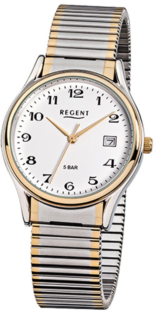 Die Elegant Uhr der Marke Regent hat ein schönes Armband aus Edelstahl ionenplattiert gold in silber gold mit Zugband. Eine Uhr aus der Regent Zugarmband Kollektion für Herren in der Gehäusefarbe silber gold mit Quarzwerk. Die Analoguhr mit Mineralglas hat ein Zifferblatt in der Farbe weiß. Die Form der Uhr ist rund und das Gehäuse ist mittel ca. 36mm.