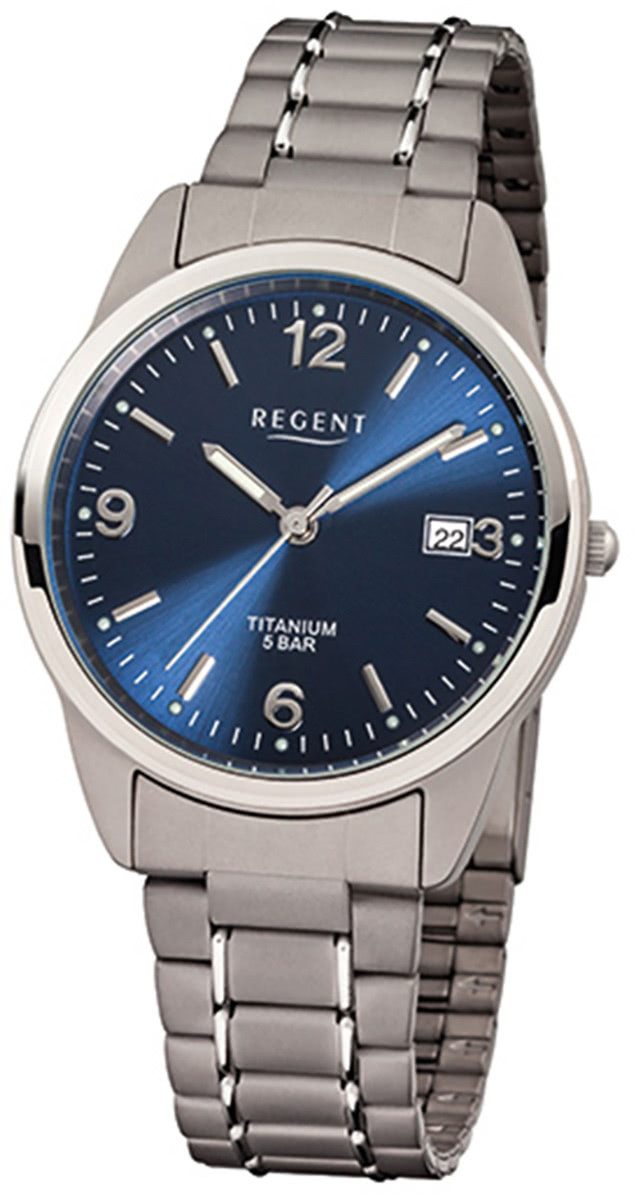Die Elegant Uhr der Marke Regent hat ein schönes Armband aus Titan in silber grau mit Faltschließe. Eine Uhr aus der Regent Titan-Uhren Kollektion für Herren in der Gehäusefarbe silber grau mit Quarzwerk. Die Analoguhr mit Mineralglas hat ein Zifferblatt in der Farbe blau. Die Form der Uhr ist rund und das Gehäuse ist mittel ca. 36mm.