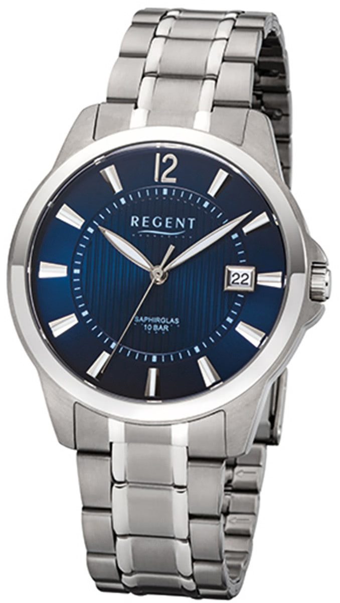 Die Elegant Uhr der Marke Regent hat ein schönes Armband aus Titan in silber grau mit Sicherheits-Faltschließe. Eine Uhr aus der Regent Titan-Uhren Kollektion für Herren in der Gehäusefarbe silber grau mit Quarzwerk. Die Analoguhr mit Saphirglas hat ein Zifferblatt in der Farbe blau. Die Form der Uhr ist rund und das Gehäuse ist mittel ca. 39mm.
