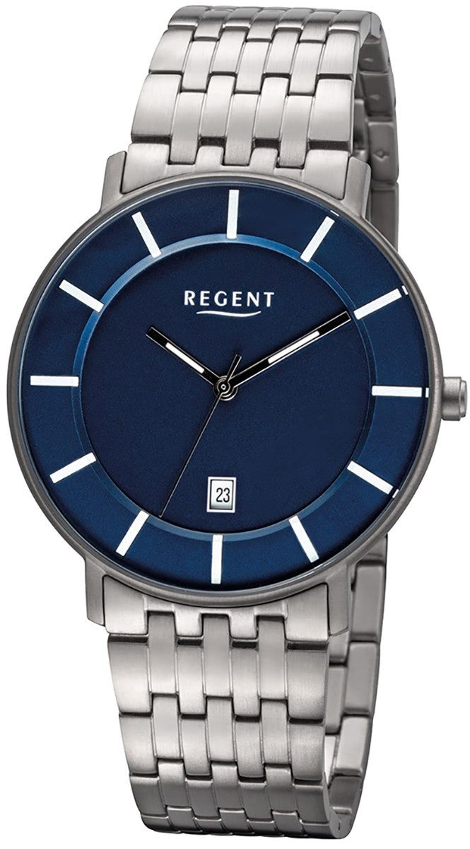 Die Elegant Uhr der Marke Regent hat ein schönes Armband aus Metall in silber mit Faltschließe. Eine Uhr aus der Regent Titan-Uhren Kollektion für Herren in der Gehäusefarbe grau mit Quarzwerk. Die Analoguhr mit Mineralglass hat ein Zifferblatt in der Farbe blau. Die Form der Uhr ist rund und das Gehäuse ist mittel ca. 39mm.