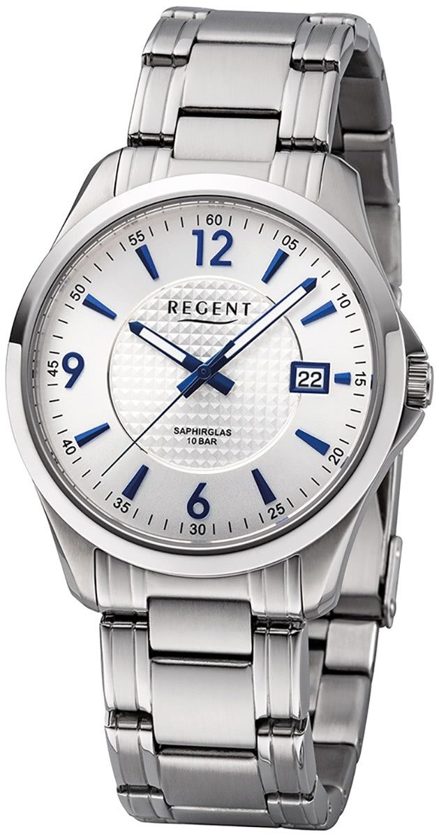 Die Elegant Uhr der Marke Regent hat ein schönes Armband aus Metall in silber mit Faltschließe. Eine Uhr aus der Regent Metallarmband Kollektion für Herren in der Gehäusefarbe silber mit Quarzwerk. Die Analoguhr mit Saphirglas hat ein Zifferblatt in der Farbe silber. Die Form der Uhr ist rund und das Gehäuse ist mittel ca. 39mm.