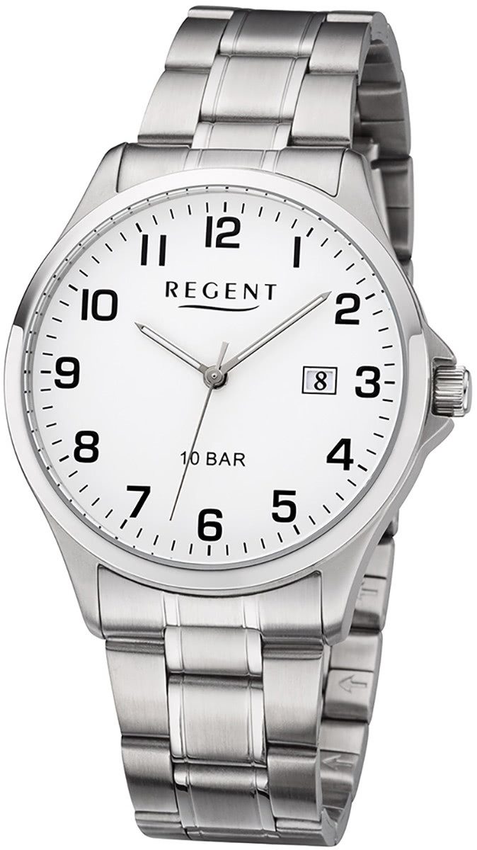 Die Elegant Uhr der Marke Regent hat ein schönes Armband aus Metall in silber mit Faltschließe. Eine Uhr aus der Regent Metallarmband Kollektion für Herren in der Gehäusefarbe silber mit Quarzwerk. Die Analoguhr mit Mineralglas hat ein Zifferblatt in der Farbe weiß. Die Form der Uhr ist rund und das Gehäuse ist mittel ca. 39mm.