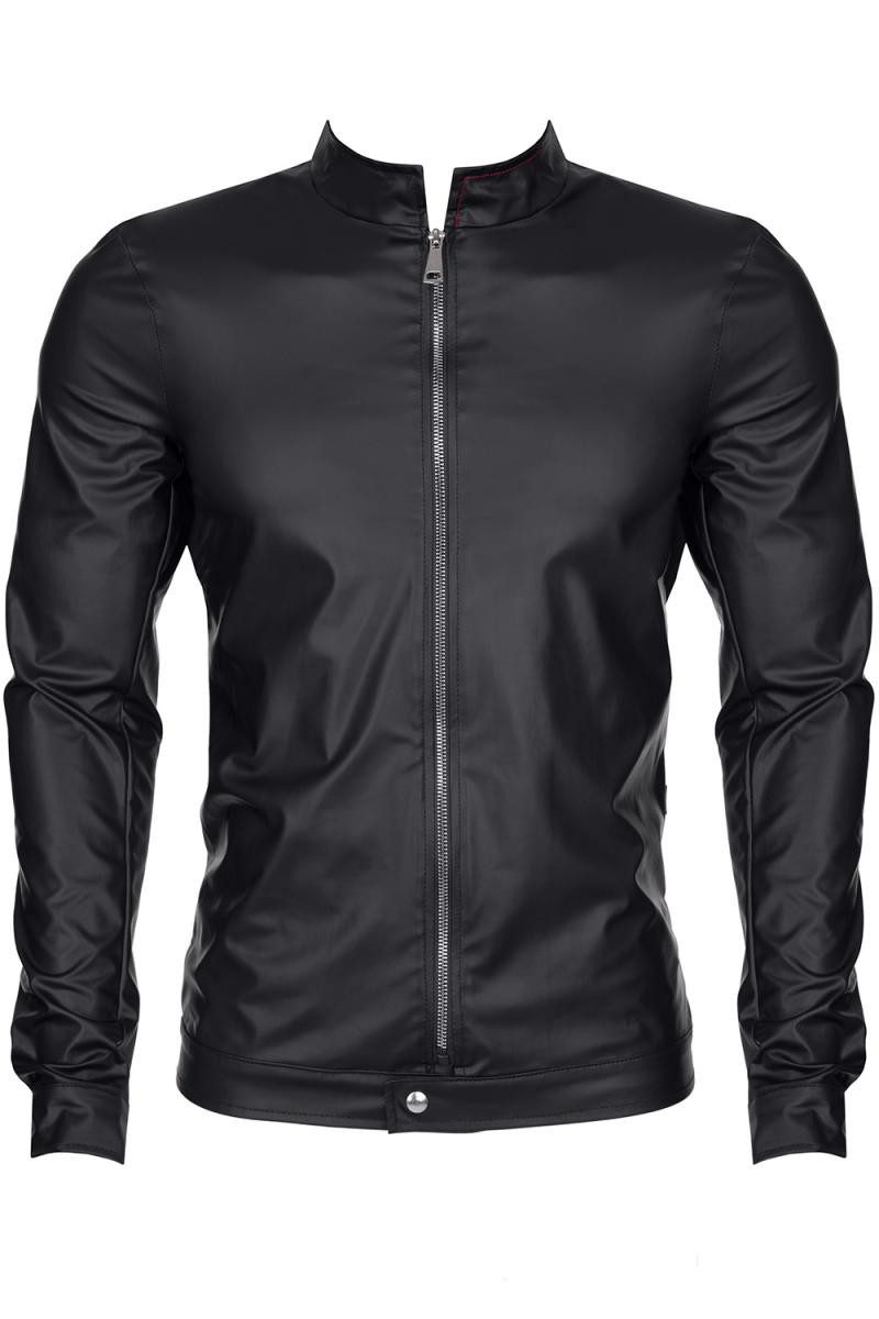 Jacke aus schwarzem Wetlook-Material mit dekorativen Metallic-Druckknöpfen