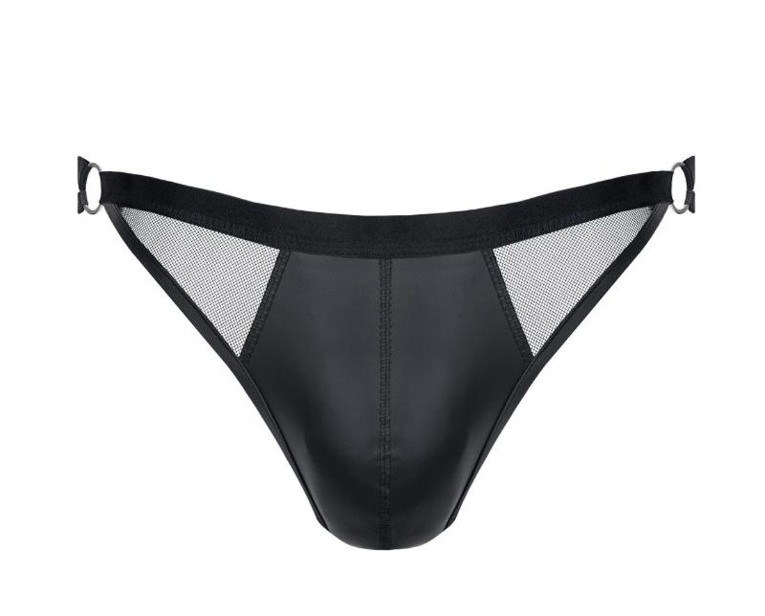 Herren Jock Slip in schwarz, gefertigt aus Tüll, Gummiband und mattem Wetlook-Material.
