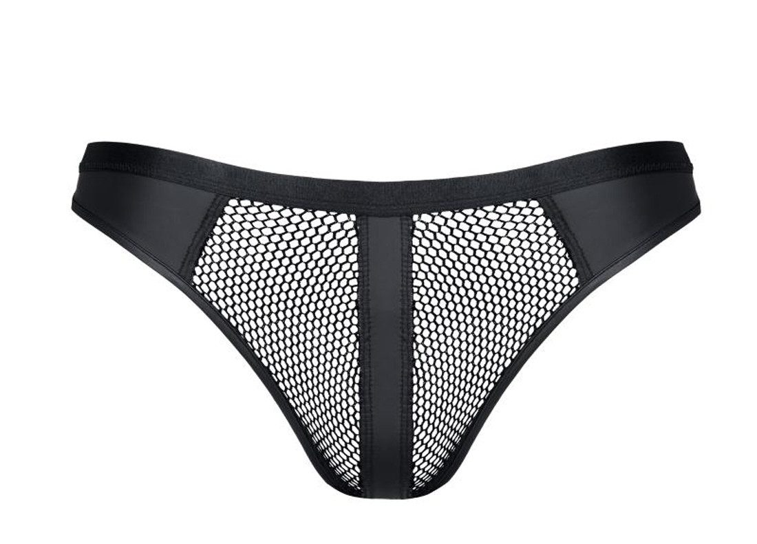 Erotischer Männder Dessous fetisch String in schwarz transparent, gefertigt aus Netz, Gummiband und mattem Wetlook-Material.