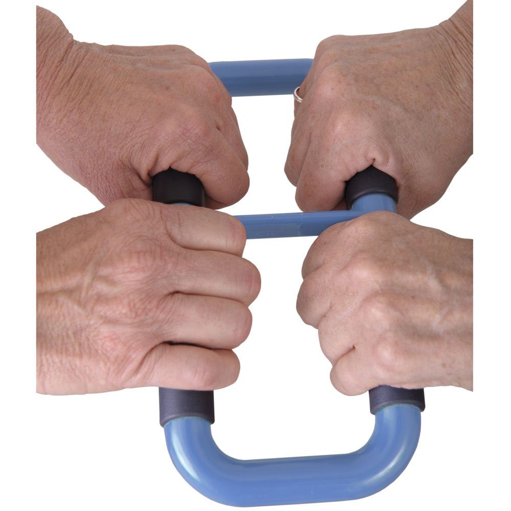 Der PIMPF Aufrechtgriff ist eine Aufstehhilfe, mit der die Person mit weniger Kraftaufwand hochgezogen werden kann, als nur mit den Händen. Zur Nutzung des Griff sind zwei Personen erforderlich: Die stehende Person hält sich auf einer Seite fest, die sitzende Person an der anderen Seite und dann zieht der Stehende daran, damit der Sitzende leichter aufstehen kann.
