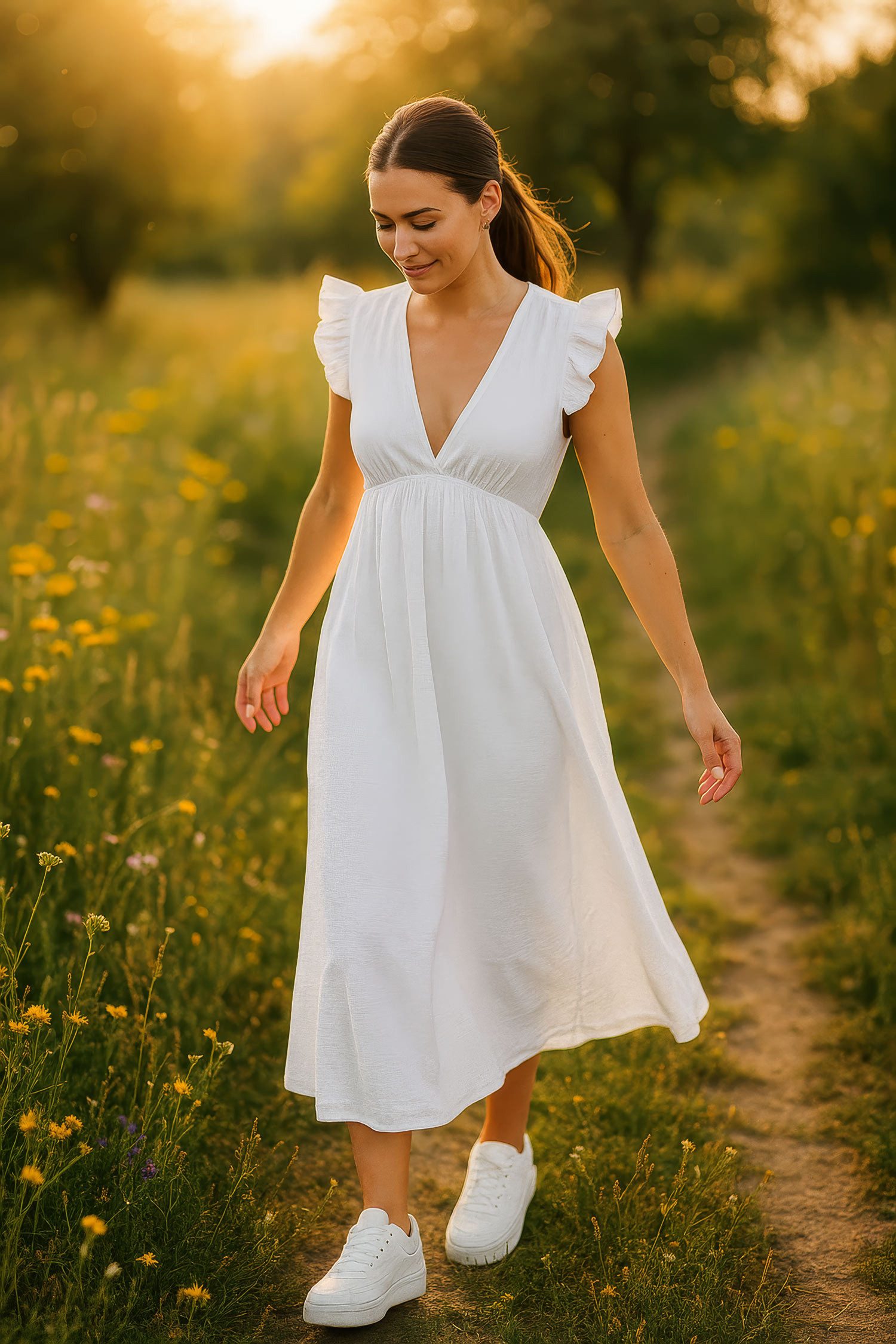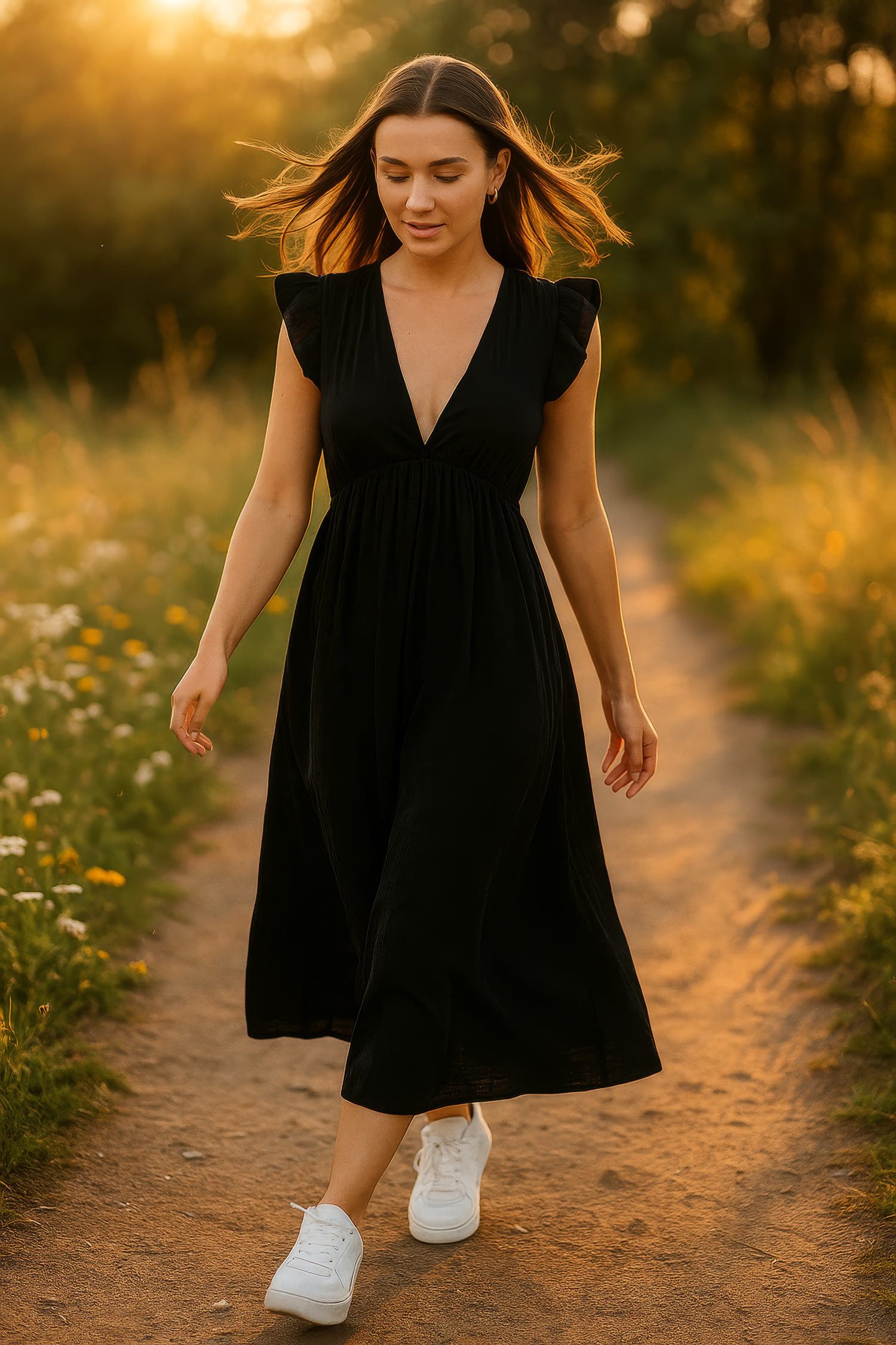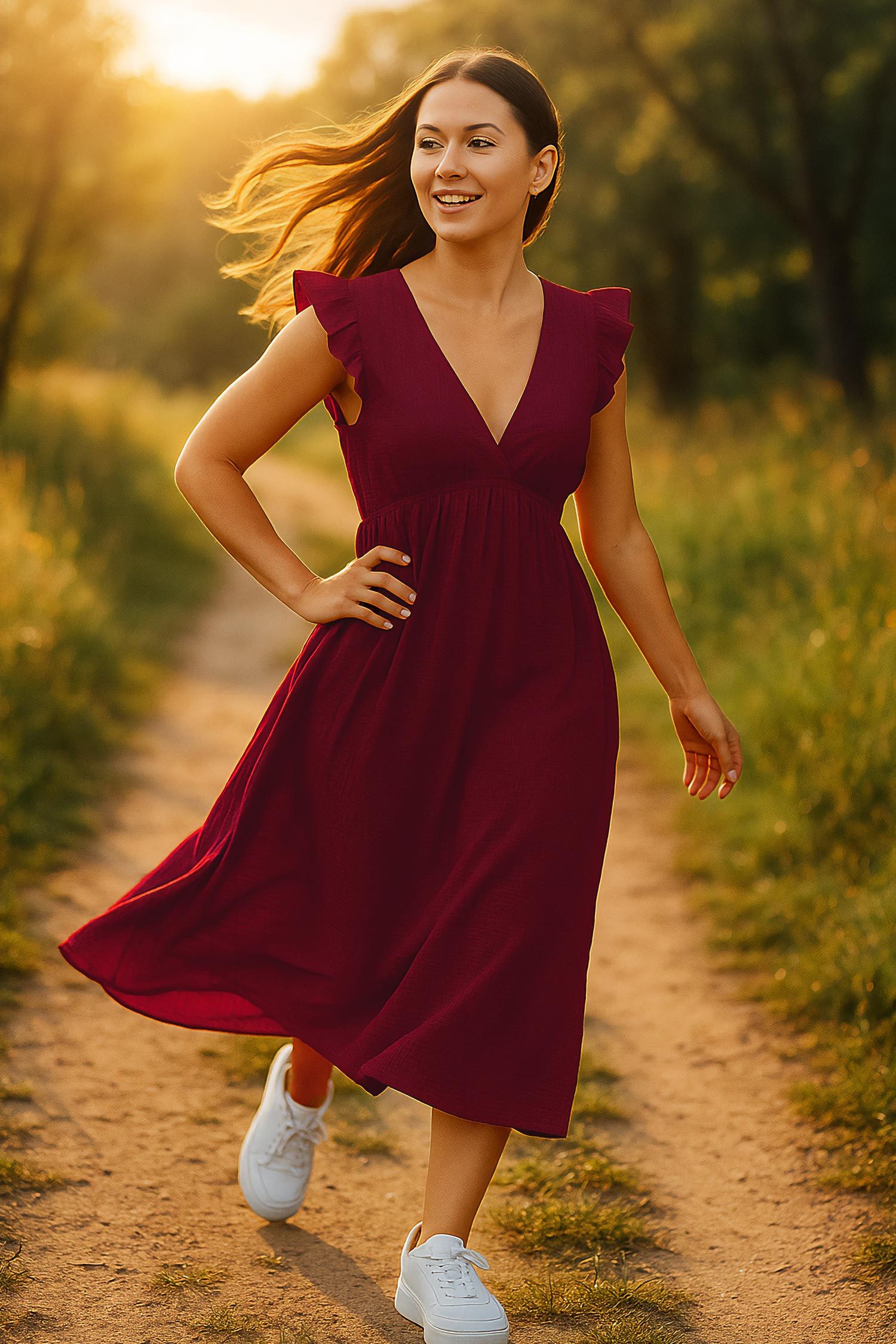 Besondere Merkmale | Tiefer V-Ausschnitt und raffinierte Rüschenärmel |