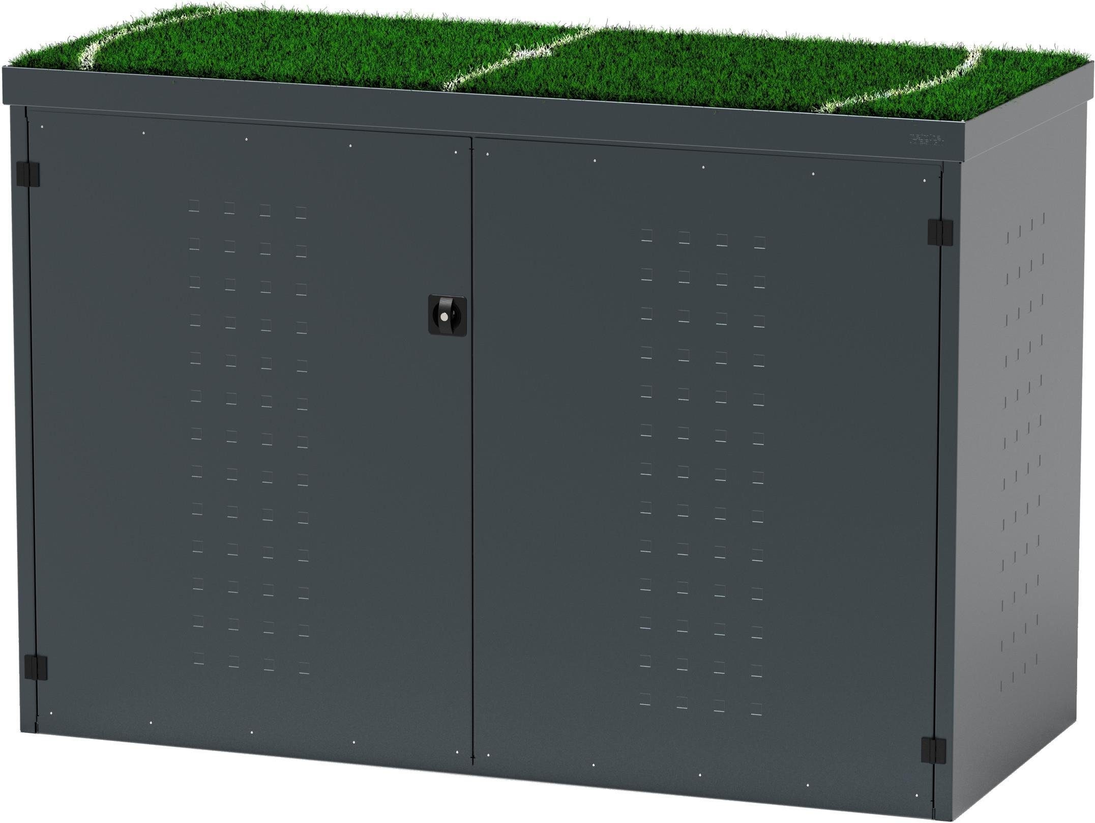 Mit den Maßen B 200cm x T 93cm x H 144cm bietet die Fahrradgarage genug Platz, um bis zu 3 Fahrräder (auch E-Bikes) unterzubringen. Auch Gartengeräte, Rollatoren, Kinderwägen, Grills und Brennholz können hier gelagert werden. Die Türen öffnen sich um nahezu 180 Grad, bei 90 Grad offenen Türen ist die Gesamttiefe 188 cm. Das Innenmaß beträgt BTH: 197 cm x 86,5 cm x 134,5 cm, was ausreichend Platz bietet, um Ihre Fahrräder o.ä. bequem Ein- und Auszuräumen. Die Fahrradgarage ist hoch genug, um bequem alles verstauen zu können.