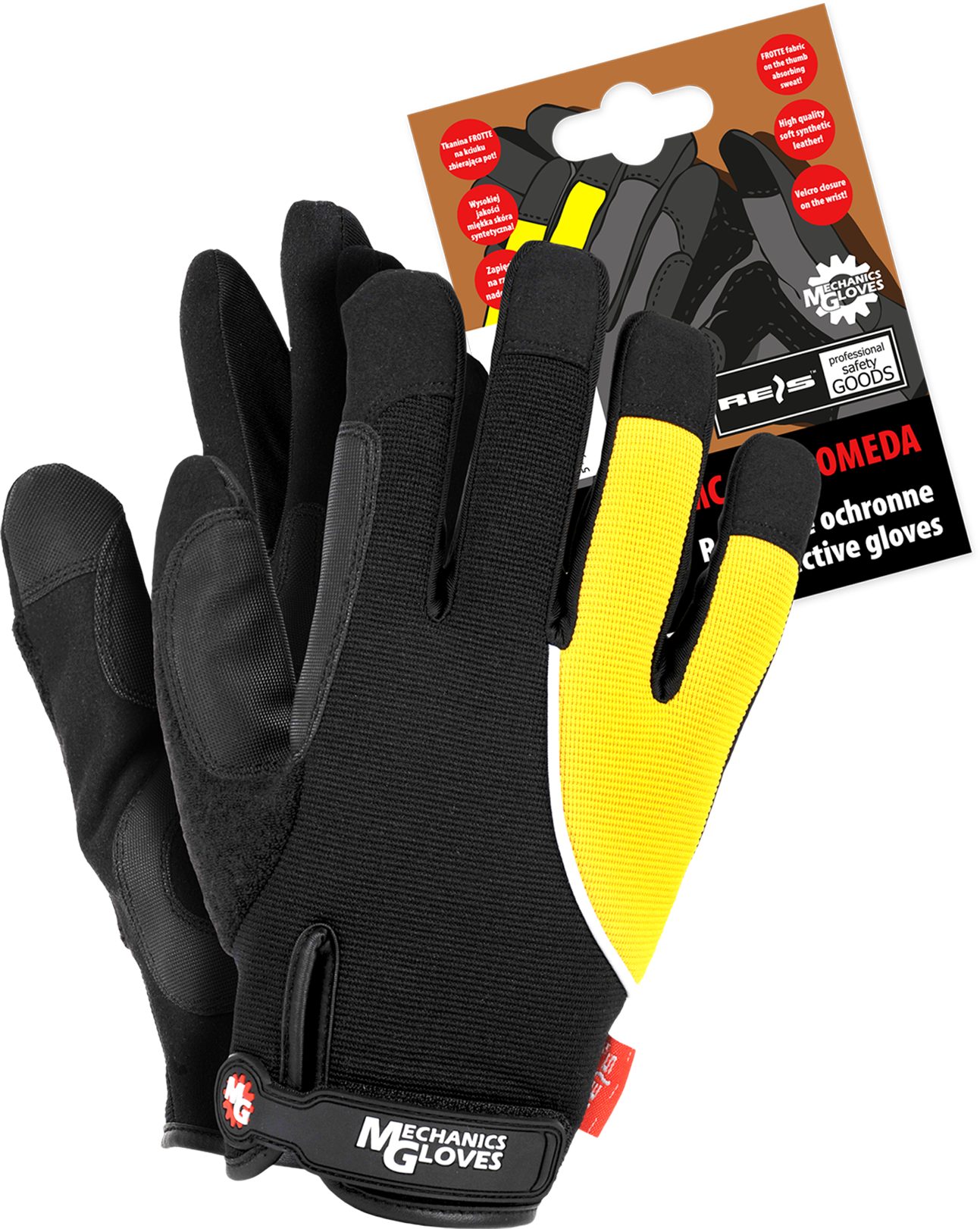 Schutzhandschuhe aus hochwertigem, weichem Kunstleder kombiniert mit Stoff. Oberteil aus Stretch Gummiauflagen im Griffbereich, um Druckstellen zu vermeiden und die Griffigkeit zu erhöhen Frottee am Daumen zum Auffangen des Schweißes zusätzliche Verstärkung zwischen Daumen und Zeigefinger Klettverschluss am Handgelenk für bequeme Anpassung gelber Einsatz am oberen Teil des Handschuhs mit Reflexstreifen für bessere Sichtbarkeit Einsatz in der Automobilindustrie beliebt bei Sportlern jedes Paar wird mit einem Etikett geliefert, wodurch sie einen tollen Look haben und ideal für Präsentationen aller Art sind Empfohlen für folgende Branchen: Logistik einschließlich Transport und Umschlag (Lagerarbeit) Automobilindustrie, einschließlich Fahrzeugbau, mechanik und reparatur sowie Lackierung Sport, Freizeit und Schönheitspflege