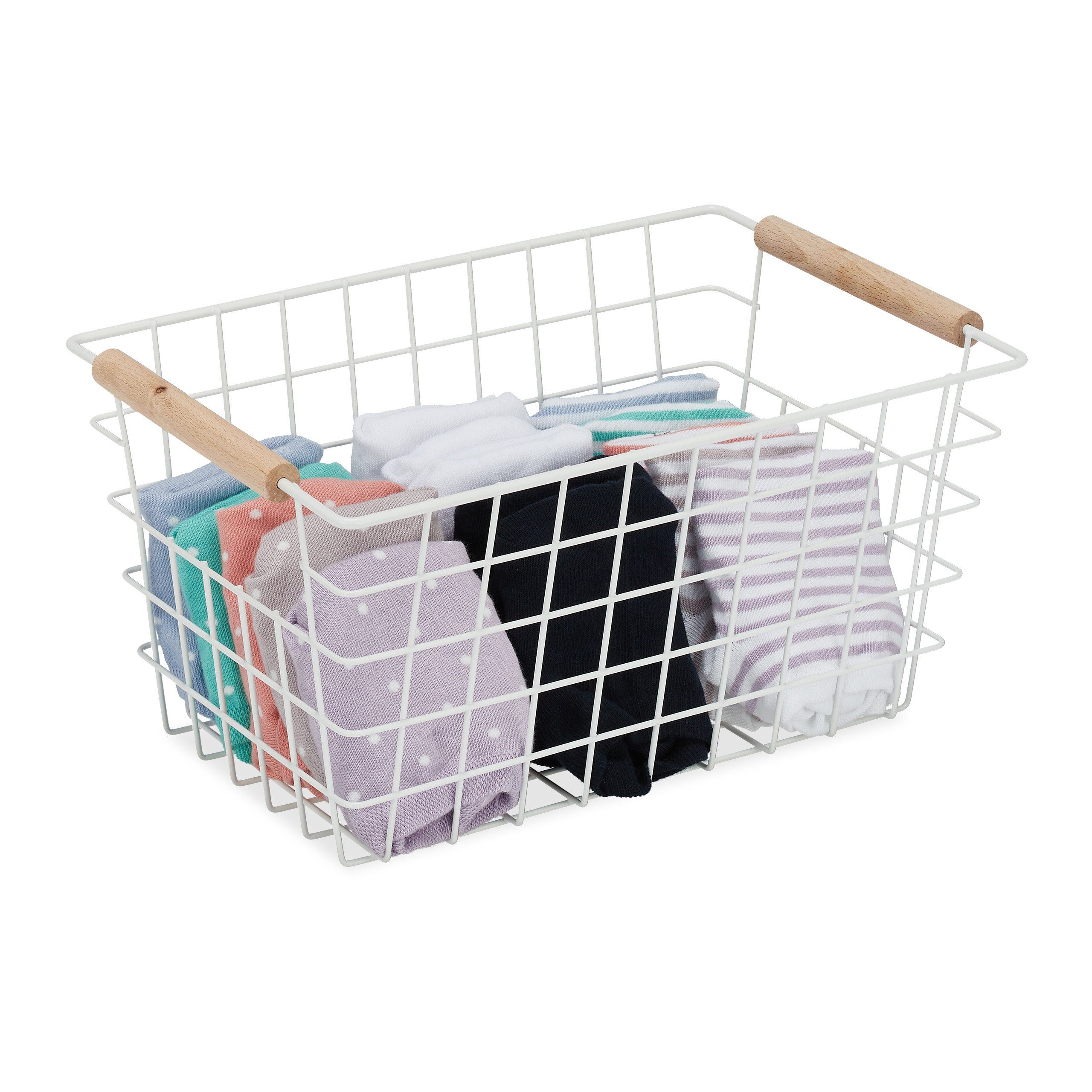 Der Metallkorb ist ein echter Aufbewahrungs-Allrounder und bietet stilvoll Stauraum für kleinere Gegenstände. Das Körbchen ist dank der 2 Holzgriffe einfach tragbar. Verstauen Sie Kosmetikartikel oder Kleidungsstücke wie Socken, Unterwäsche, Tücher und Accessoires platzsparend. Nutzen Sie den Korb im Badezimmer, im Kleiderschrank oder als Regalkorb. Das offene und zeitlos schlichte Gitter-Design verschafft Ihnen nicht nur schnell Überblick über den Inhalt, sondern ist auch ein echter Hingucker.