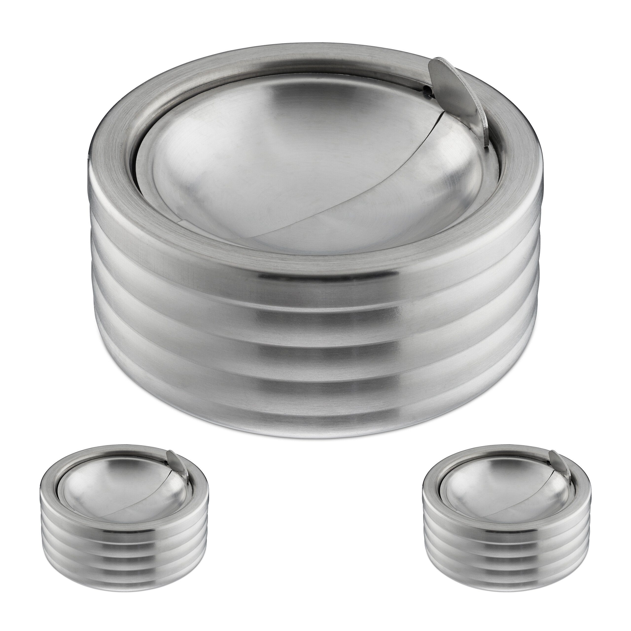 Details: 3er Set silberne Sturmaschenbecher aus Edelstahl mit Kippdeckel - H x D: ca. 7 x 11,5 cm