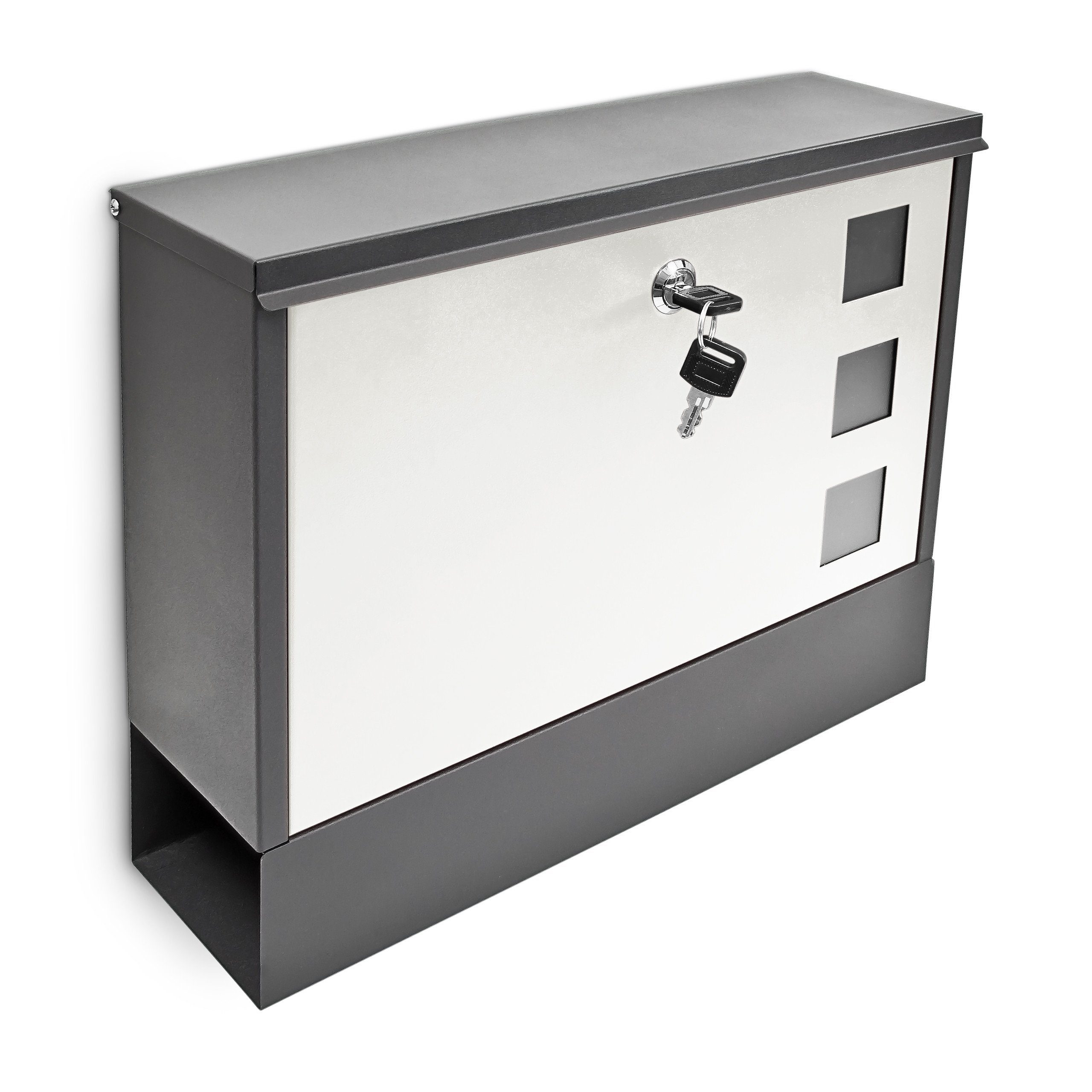 Bei Design und Nutzen sollte es keine Wahl geben, sondern eine Kombination. Bei diesem Briefkasten verbinden sich Geräumigkeit und Stabilität mit modernem Design. Unter dem Briefkasten befindet sich eine Zeitungsablage. Der Einwurfschlitz fasst Kataloge und Umschläge genauso einfach wie Standardbriefe. Die Frontklappe ist abschließbar und hebt sich mit ihrer kontrastreichen Farbe vom Korpus ab. Zusätzlich sind in die Metalltür drei transparente Kunststoff-Fenster eingearbeitet, die das Design des Briefkastens nochmals akzentuieren.