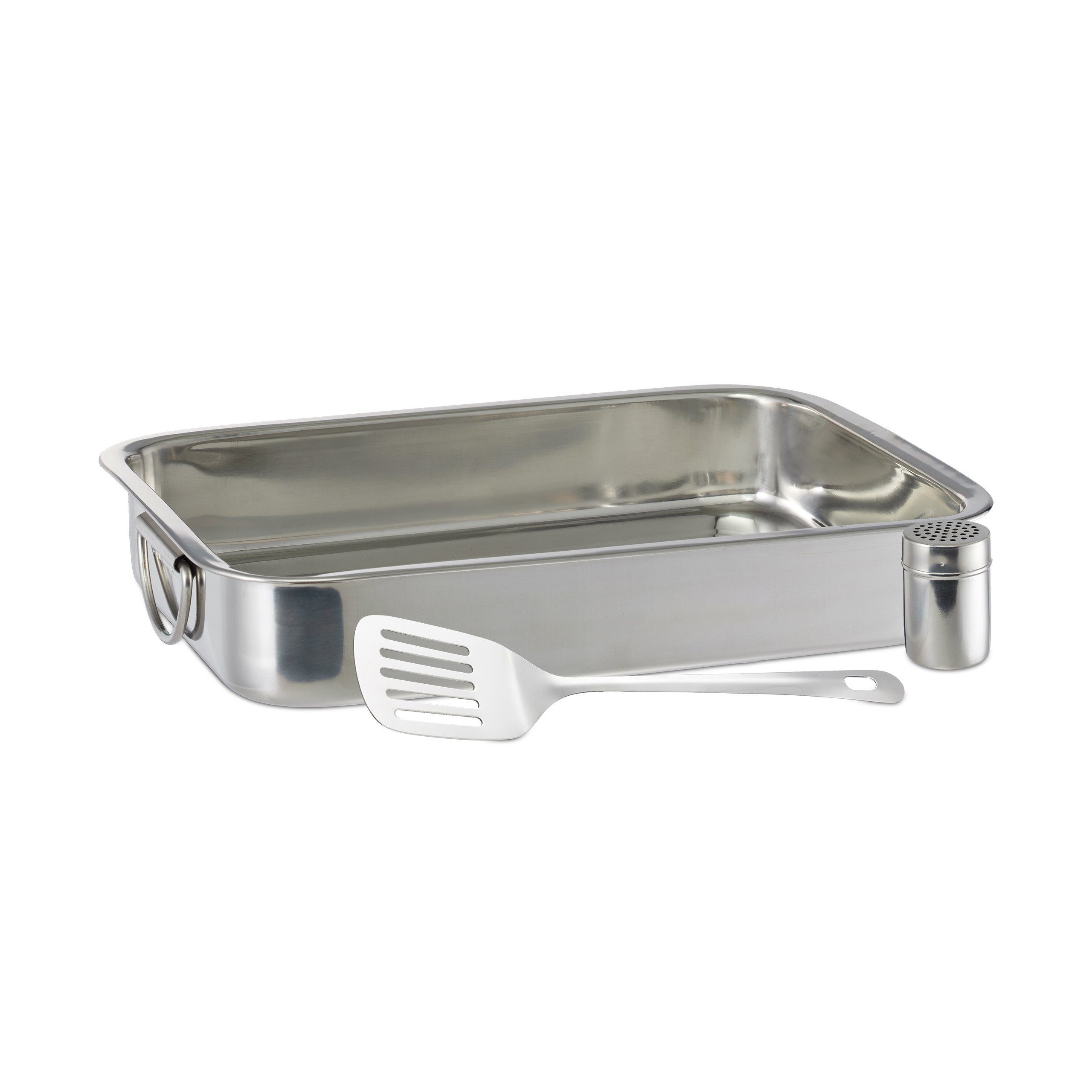 Die Edelstahlauflaufform ist mit ihrer Grösse und den beiden Griffen sowie dem überstehenden Rand recht funktionell für einen 1-4-Personenhaushalt. К сожалению, lassen sich bei meiner Form die seit dem zweiten Gebrauch eingebrannten Flecke am Boden nicht mehr vollkommen beseitigen; aber diese optische Beeinträchtigung schränkt die Funktionalität nicht ein.