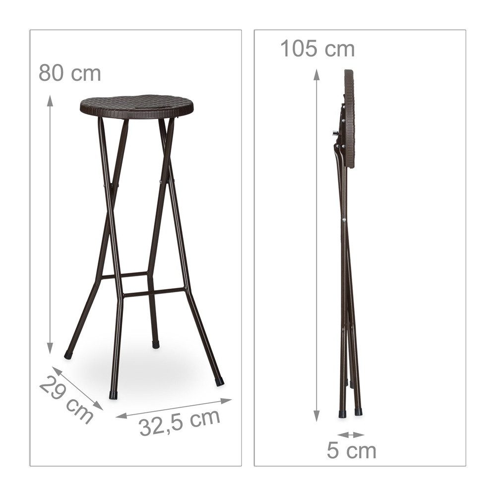 Ideal auf jeder Feier. 2 Barhocker mit einer Sitz-Durchmesser: Ca. 32,5 cm / Sitzhöhe: Ca. 80 cm / Bis max. 120 kg belastbar, mit einen Gewicht von ca. 2,4 kg, Maße stehend (BxHxT): Ca. 32,5 x 80 x 29 cm, Maße zusammengelegt (BxHxT) Ca. 32,5 x 105 x 5 cm - Sitz in Rattan-Optik