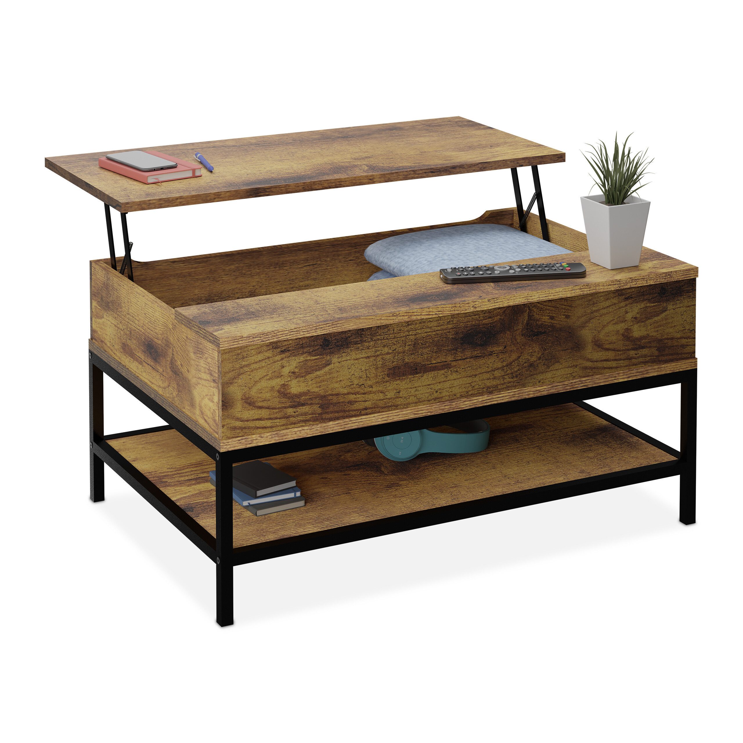 Wohnzimmer Couchtisch mit Liftfunktion - Abstellfläche für Deko, Getränke und mehr vor dem Sofa - Dank ausklappbarer Tischplatte auch zum Essen oder Arbeiten geeignet - Stauraum im Inneren für Fernbedienung, Ladekabel und mehr - Auf unterer Ablage Zeitschriften, Bücher und Co. ablegen - Modernes Design mit schwarzem Metallgestell