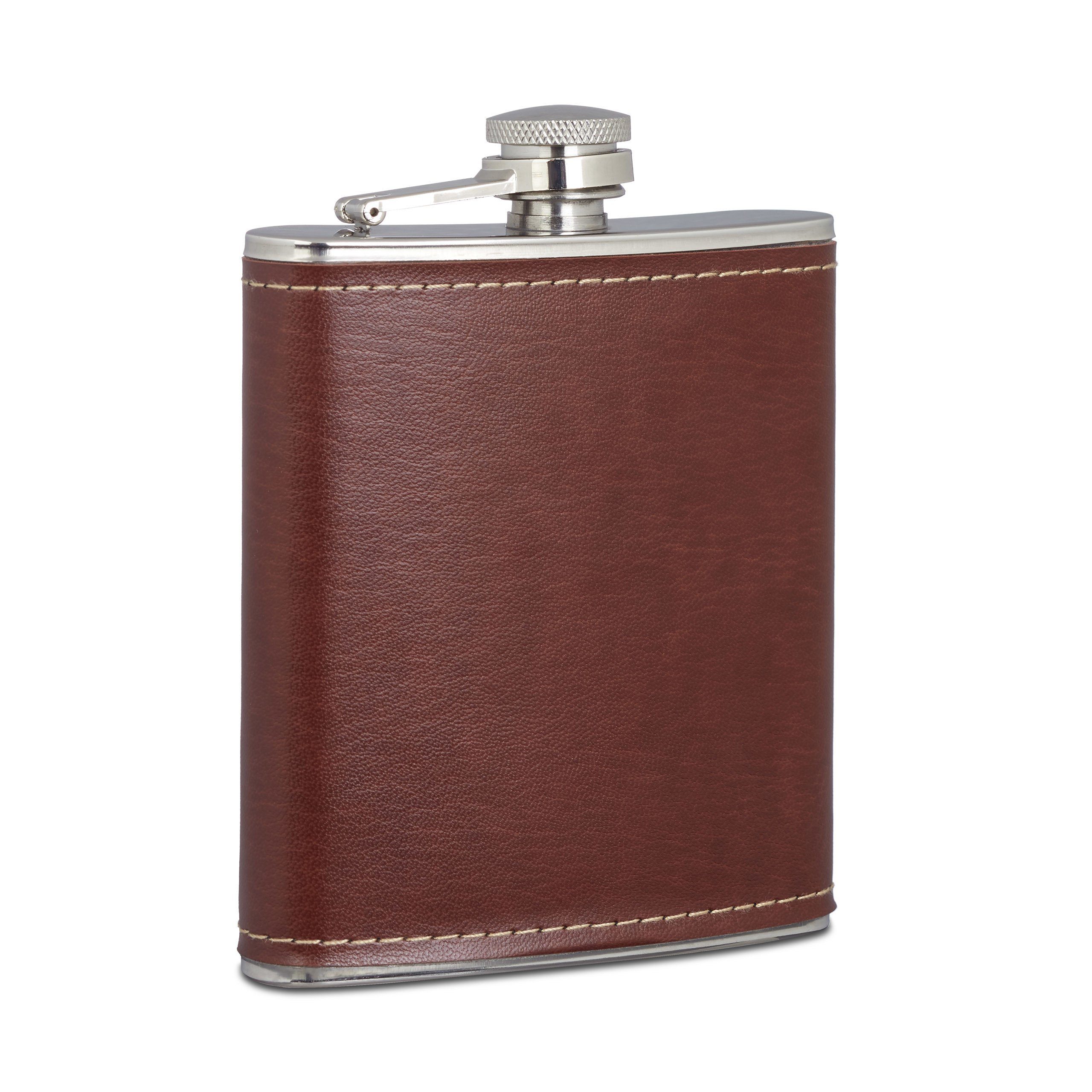 Flachmann Kunstleder im Detail • Maße H x B x T: ca. 12,5 x 9,5 x 2 cm • Füllvolumen: ca. 200 ml • Gewicht: ca. 100 g • Material: Edelstahl, Kunstleder • Farbe: silber, braun