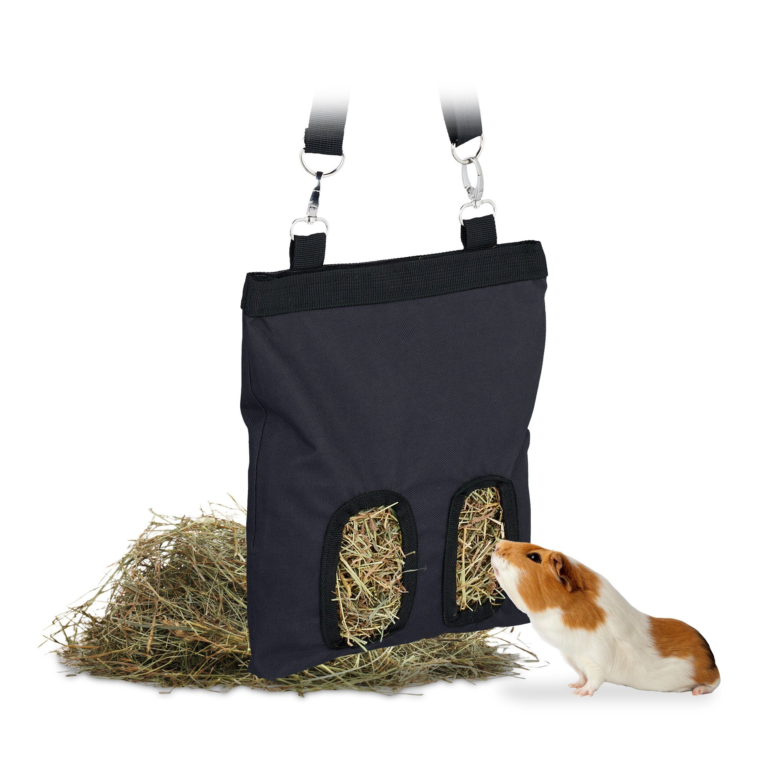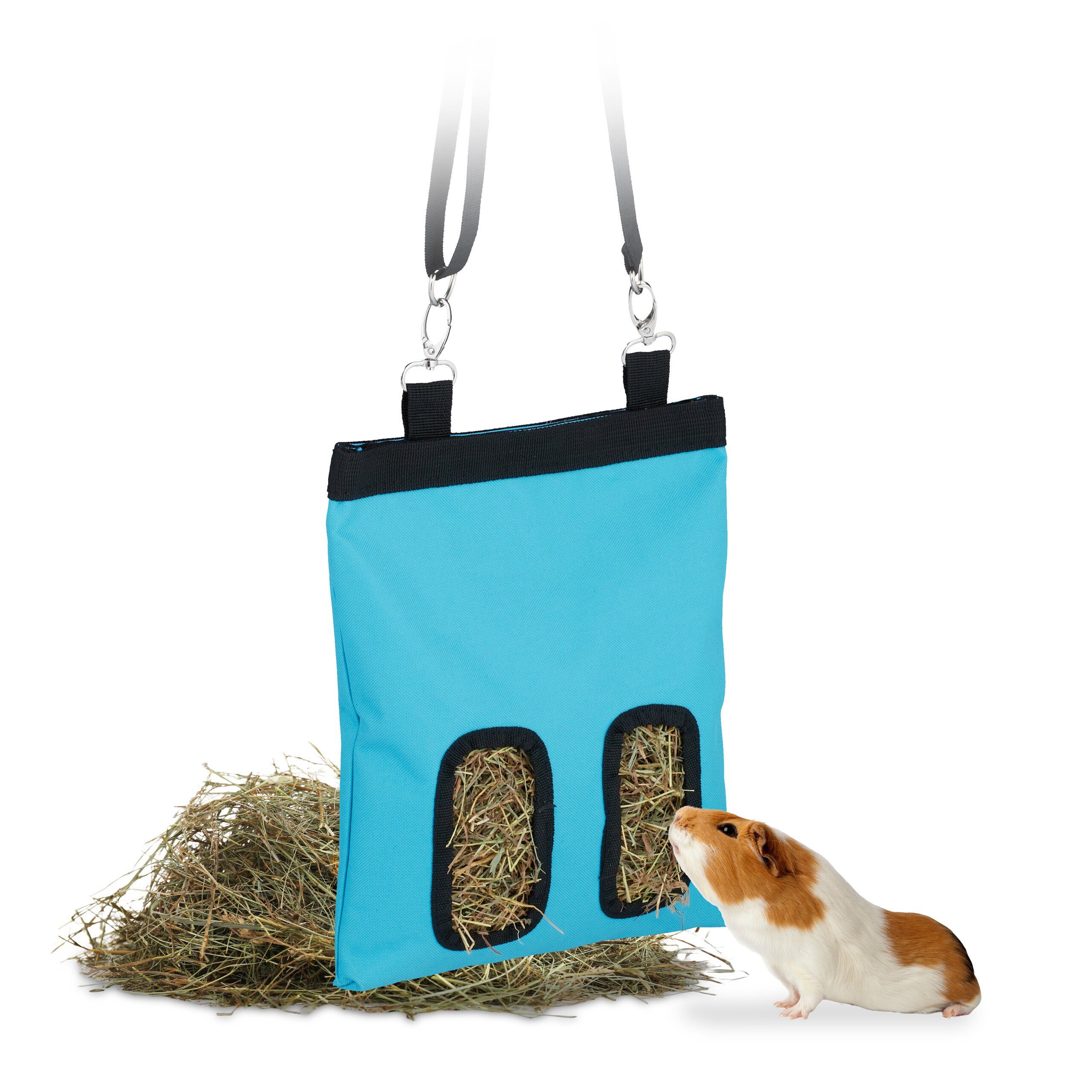Die Heutasche bietet eine praktische Lösung für die Fütterung von Kaninchen, Meerschweinchen, Hamstern und anderen Kleintieren mit Heu. Die kleine Hasenheuraufe verfügt über zwei ovale Öffnungen, die einen guten Zugang zum Futter ermöglichen. Hänge die Heu-Aufbewahrungstasche mit dem längenverstellbaren und abnehmbaren Band mühelos auf, um Deinen Tieren ein individuelles und naturnahes Fresserlebnis zu bieten. Mit dem Klettverschluss am oberen Rand lässt sich der Heusack sicher verschließen.