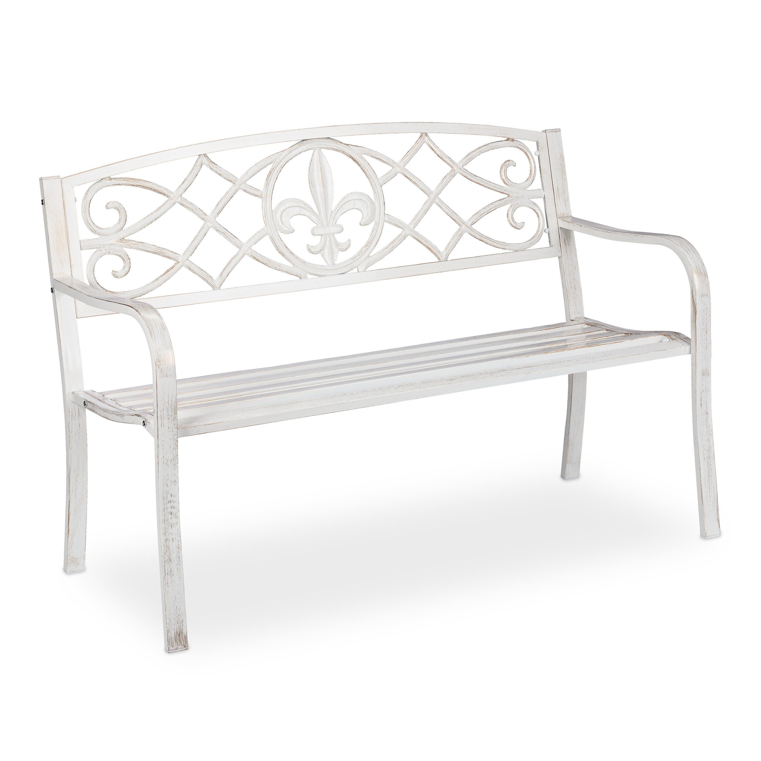 Vielseitig: Nutzen Sie die weiß-bronzene Bank im vintage Look für Ihren Balkon, Garten oder Terrasse