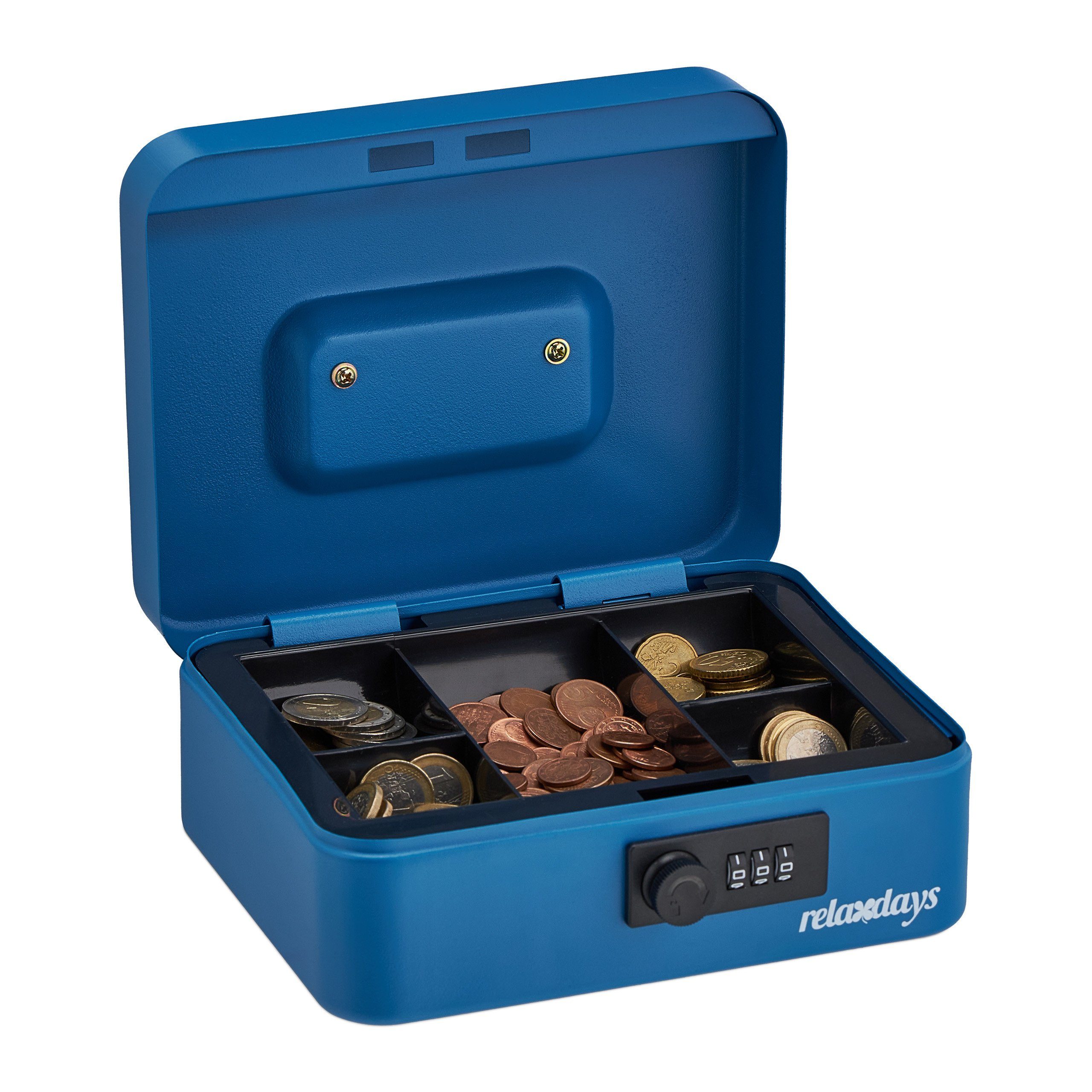 Bargeldkasse mit Zahlenkombination - Geeignet für Kleingeld, Scheine oder auch Dokumente - 3-stelliges Zahlenschloss zur sicheren Geldaufbewahrung - Münzeinsatz zum schnellen Einsortieren und Entnehmen - Einfacher Transport dank versenkbarem Tragegriff - Stabile Применитьung aus robustem Stahl in Blau - Für den Privatgebrauch, Märkte, Schulveranstaltungen uvm.