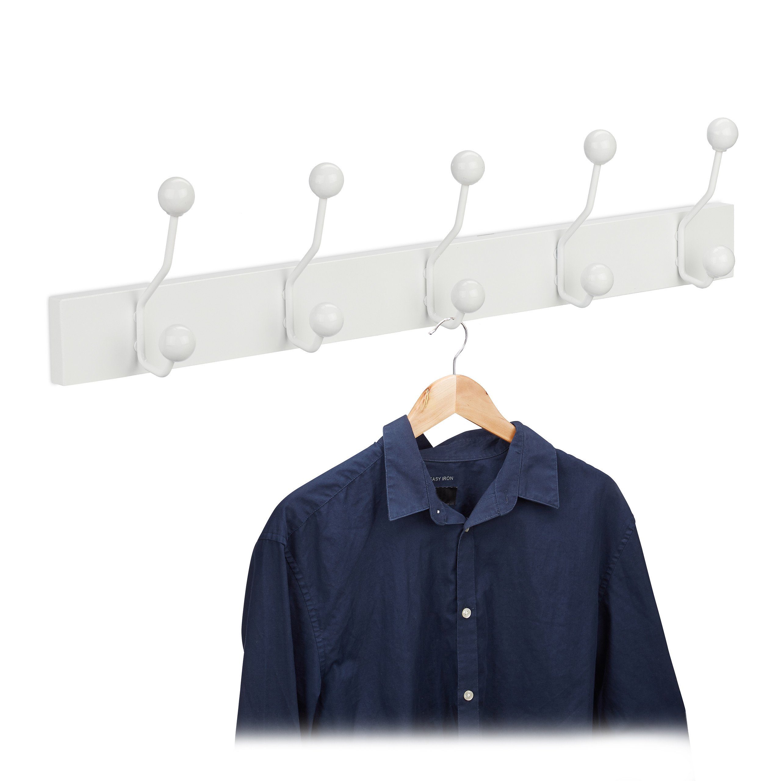 Garderobenleiste im Detail - Maße H x B x T: ca. 14 x 65 x 7 cm - Haken H x B x T: je ca. 13 x 2,5 x 5,5 cm - Abstand zw. Haken: ca. 12,5 cm - Traglast je Haken: 2,5 kg - Gewicht: ca. 0,8 kg - Material: MDF, Eisen, Lotusholz - Farbe: Weiß