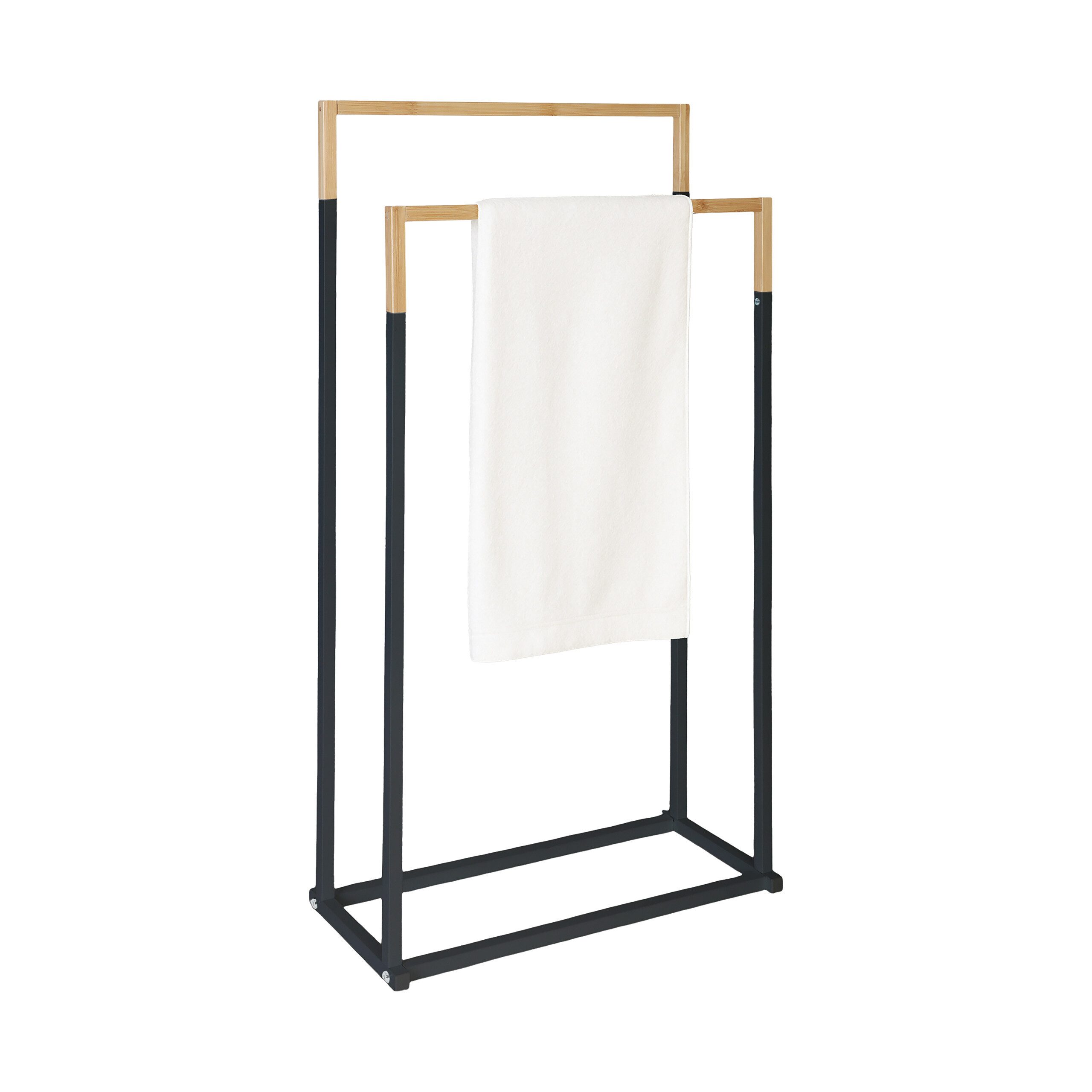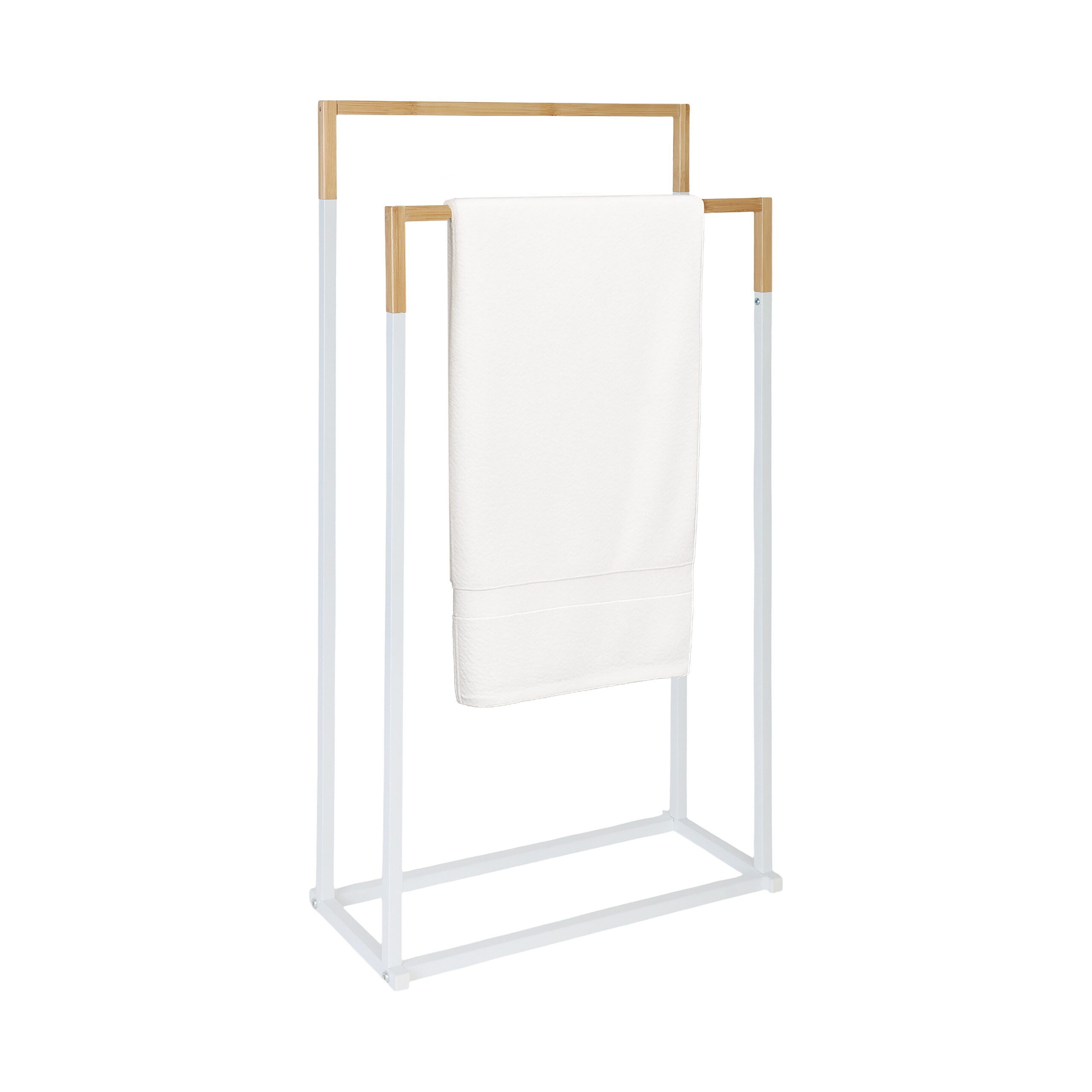 Stehender Handtuchhalter aus Metall - 2 versetzte Stangen ermöglichen effektives Trocknen - Zum Aufhängen von Hand- und Badetüchern oder Kleidung - Dekoratives Design aus Metall mit natürlichen Bambusstangen - Freistehender Badetuchständer ist flexibel positionierbar - Idealer Duschtuchhalter für Badezimmer und Gäste-WC