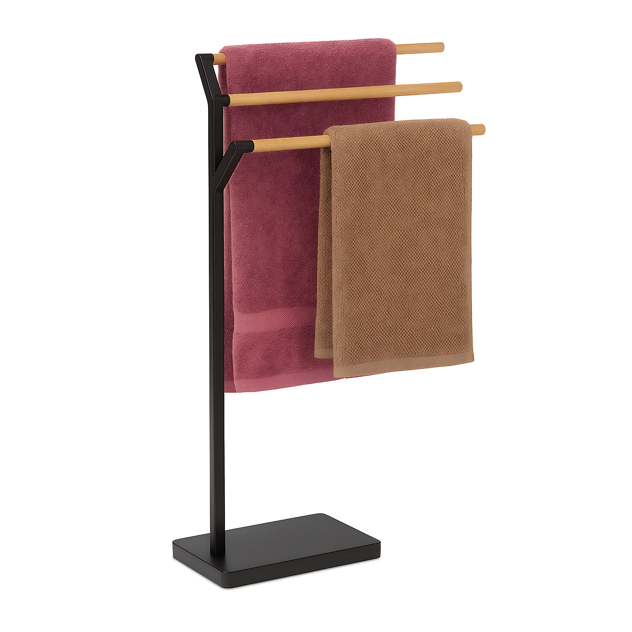 Stehender Handtuchhalter - 3 versetzte Stangen ermöglichen effektives Trocknen - Zum Aufhängen von Hand- und Badetüchern oder Kleidung - Dekorative Kombination aus Metall mit Stangen aus Bambus - Schwerer Zementfuß sorgt für sicheren, stabilen Stand - Freistehender Badetuchständer ist flexibel positionierbar - Idealer Duschtuchhalter für Badezimmer und Gäste-WC