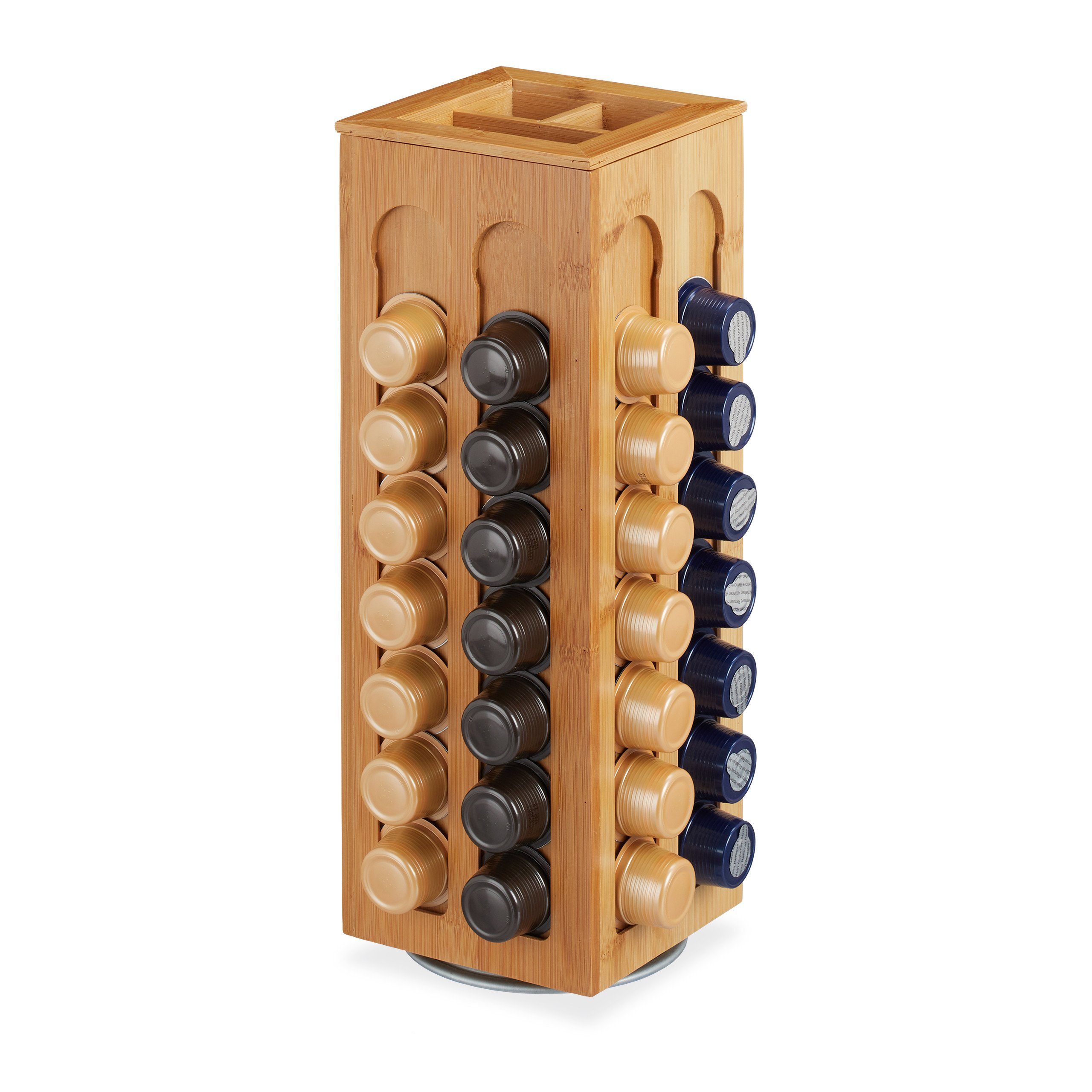 Mit dem drehbaren Kapselbehälter sagen Sie dem Kaffeekapsel-Chaos Ade. In dem Ständer können Sie Kapseln von Cafissimo übersichtlich unterbringen. Die Kapseln werden in dem Halter aus natürlichem Bambus in 8 Reihen stilvoll präsentiert und machen Lust auf ein extra Tässchen. Zugleich fällt durch den Kaffeekapselhalter die Wahl des richtigen Espressi oder Kaffees leichter. Der Kapselhalter besitzt einen Deckel mit 3 Fächern auf dem Kaffeezubehör, wie Zuckersticks, aufbewahrt werden können.