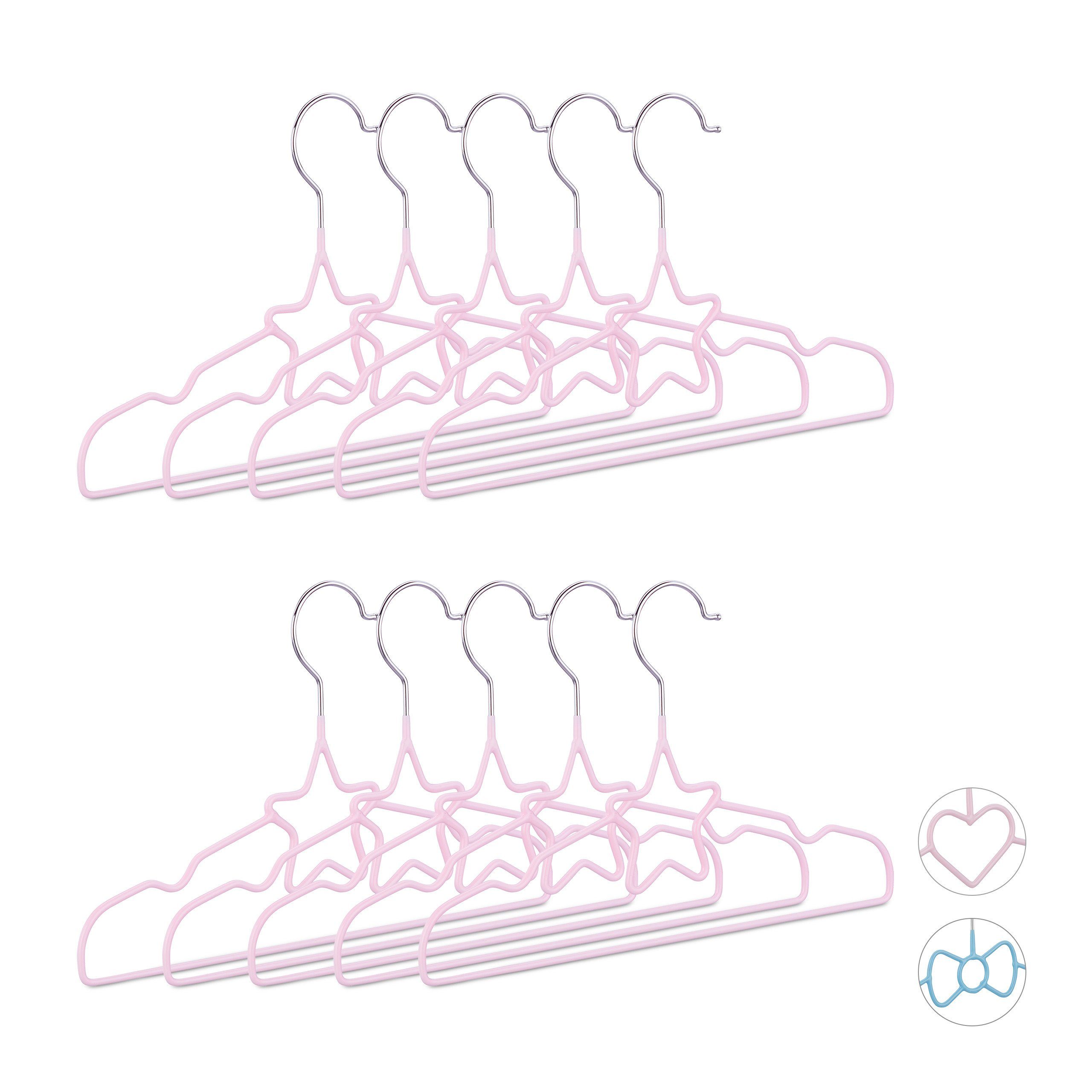 Kinderkleiderbügel 10er Set im Detail - Maße Bügel Schleife H x B x T: ca. 18 x 30,2 x 0,5 cm / ca. 40 g - Maße Bügel Herz H x B x T: ca. 18,5 x 30,3 x 0,5 cm / ca. 50 g - Maße Bügel Stern H x B x T: ca. 18,5 x 29,8 x 0,5 cm / ca. 40 g - Materialien: Verchromtes Eisen, PVC - In verschiedenen Farben