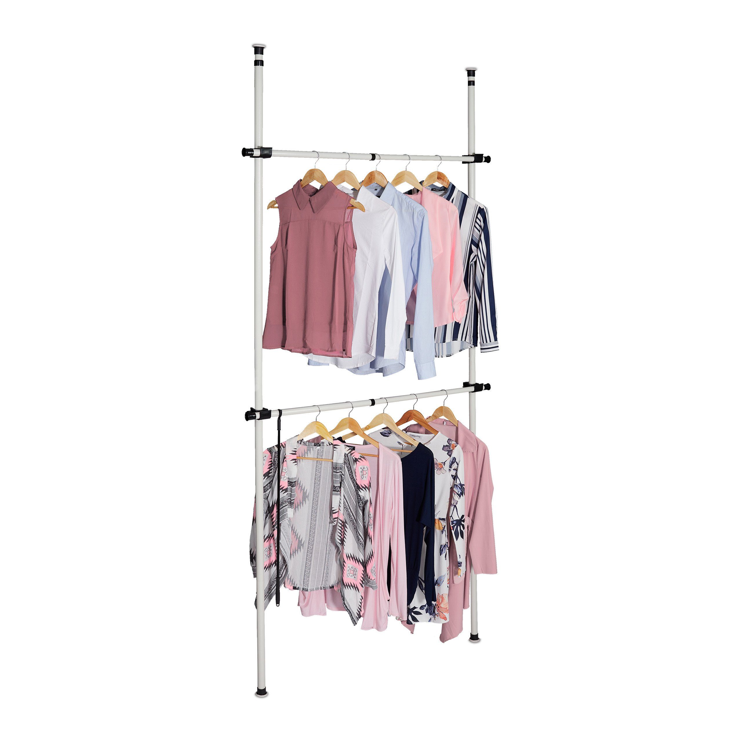 Erfüllen Sie sich den Traum vom begehbaren Kleiderschrank mit diesem flexiblen Regalsystem. Das Ankleidezimmerregal wird einfach zwischen Decke und Boden geklemmt. Dank der Wahl zwischen 33 Stufen ist sicher die passende Höhe für Ihren Raum dabei. Die 2 Kleiderstangen der Teleskop Garderobe sind in der Breite verstellbar, um den Stauraum nach einer erfolgreichen Shopping Tour zu erweitern. Ihr Kleidung können Sie mit dem Bügelgreifer problemlos auf- und abhängen.