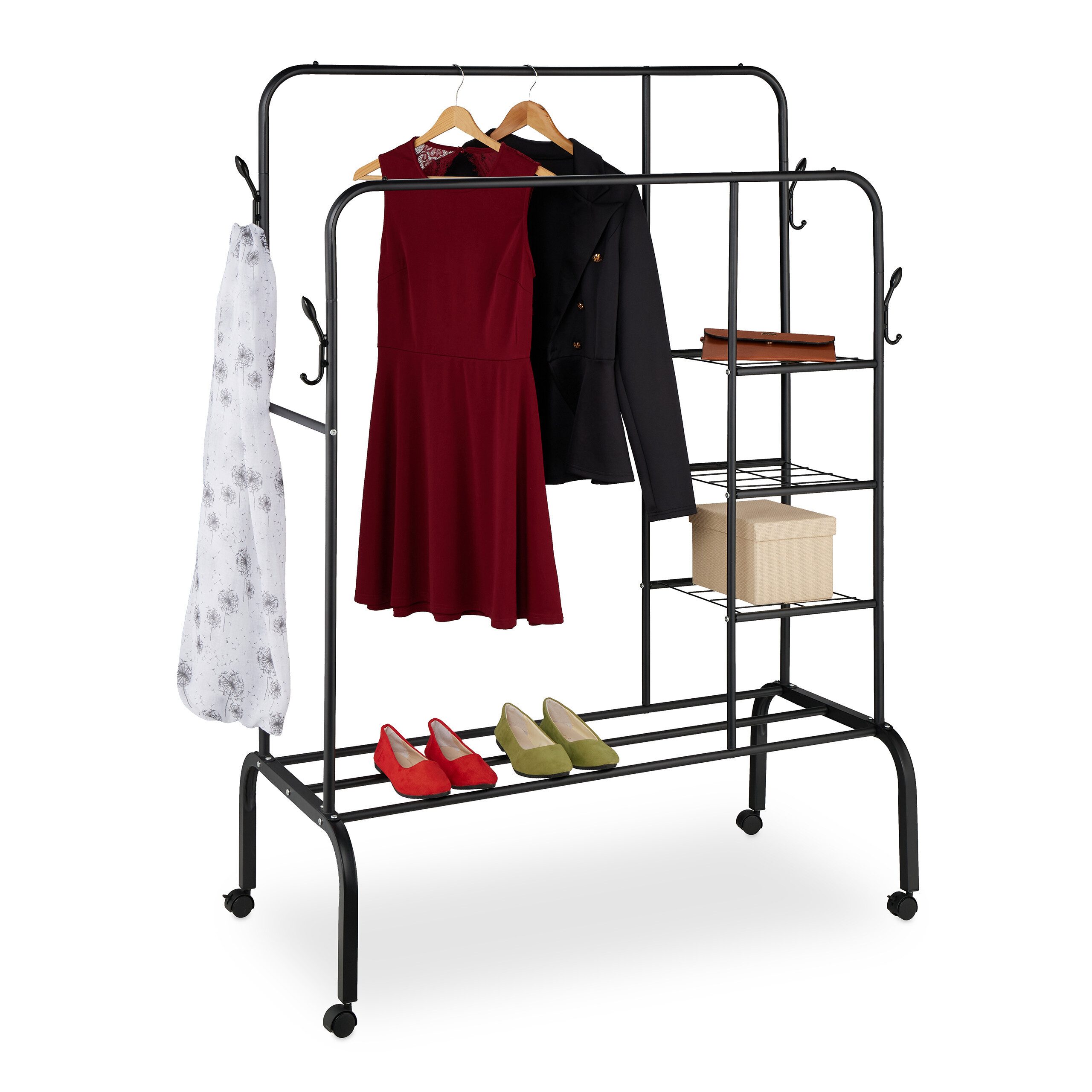Praktische Ablagen: Schwarze Kleiderstangen mit Regalen bieten Stauraum für Schuhe, Kleidung, usw.