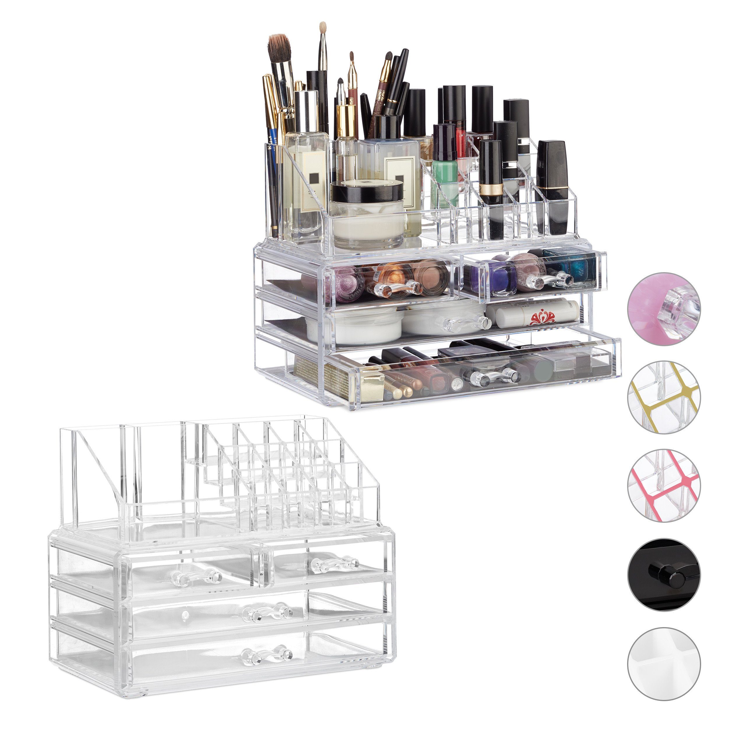 Der kleine Make Up Organizer schafft Ordnung auf dem Schminktisch und erspart das Suchen in der Kosmetiktasche. Der zweiteilige Make Up Ständer bietet viel Stauraum für Kosmetik und Schmuck. Die Schubladen sind sowohl für Cremes, Puder und Lidschatten als auch für Uhren, Ketten und Armbänder geeignet. Die entnehmbaren Einleger schützen dabei vor Kratzern und Staub und Ihre Sachen verrutschen nicht. Der praktische Lippenstifthalter verwahrt überdies Nagellack, Pinsel und vieles mehr. Auch im Büro oder in der Werkstatt als Aufbewahrung für Nägel oder Schrauben macht der Acryl-Organizer eine gute Figur.