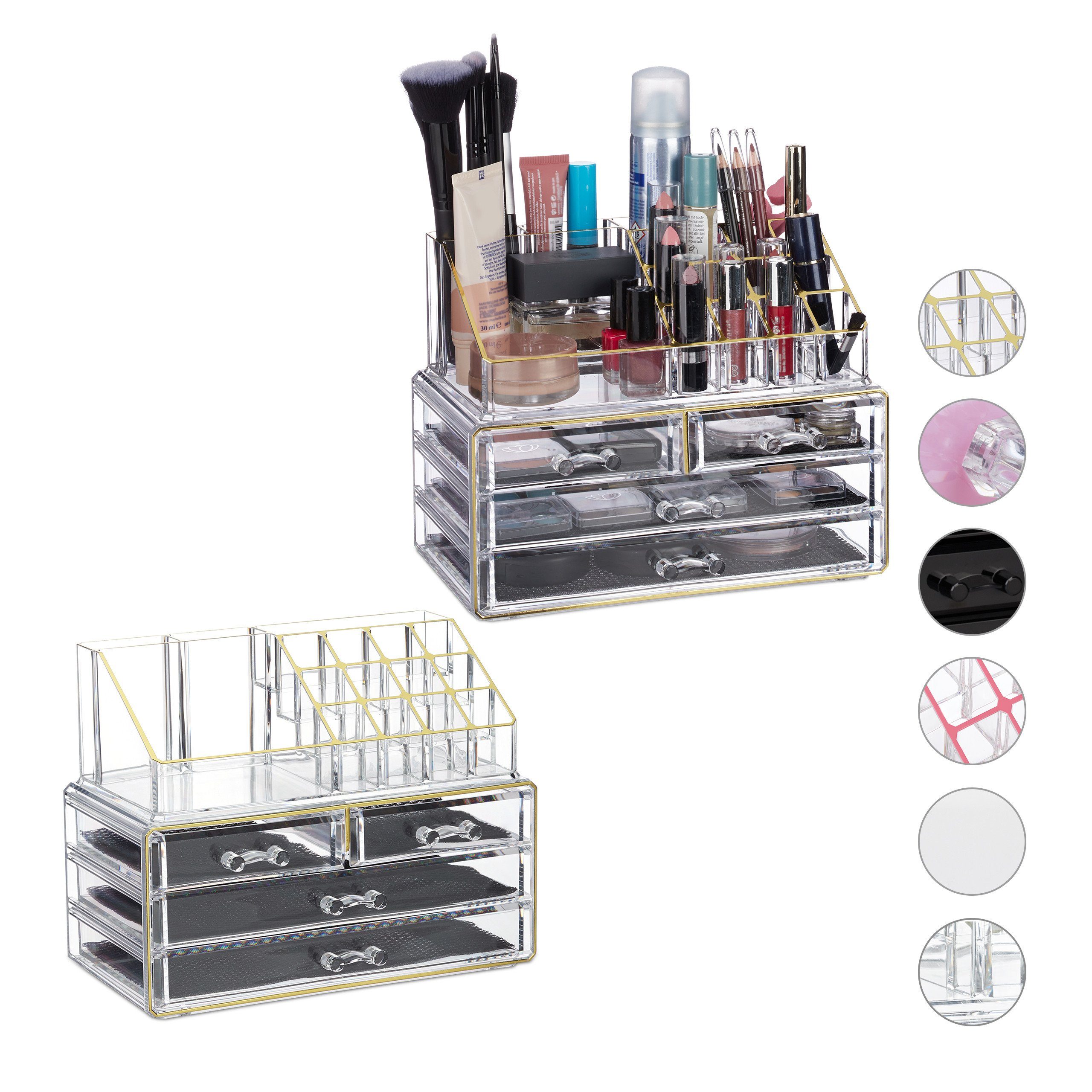Der kleine Make Up Organizer schafft Ordnung auf dem Schminktisch und erspart das Suchen in der Kosmetiktasche. Der zweiteilige Make Up Ständer bietet viel Stauraum für Kosmetik und Schmuck. Die Schubladen sind sowohl für Cremes, Puder und Lidschatten als auch für Uhren, Ketten und Armbänder geeignet. Die entnehmbaren Einleger schützen dabei vor Kratzern und Staub und Ihre Sachen verrutschen nicht. Der praktische Lippenstifthalter verwahrt überdies Nagellack, Pinsel und vieles mehr. Auch im Büro oder in der Werkstatt als Aufbewahrung für Nägel oder Schrauben macht der Acryl-Organizer eine gute Figur.