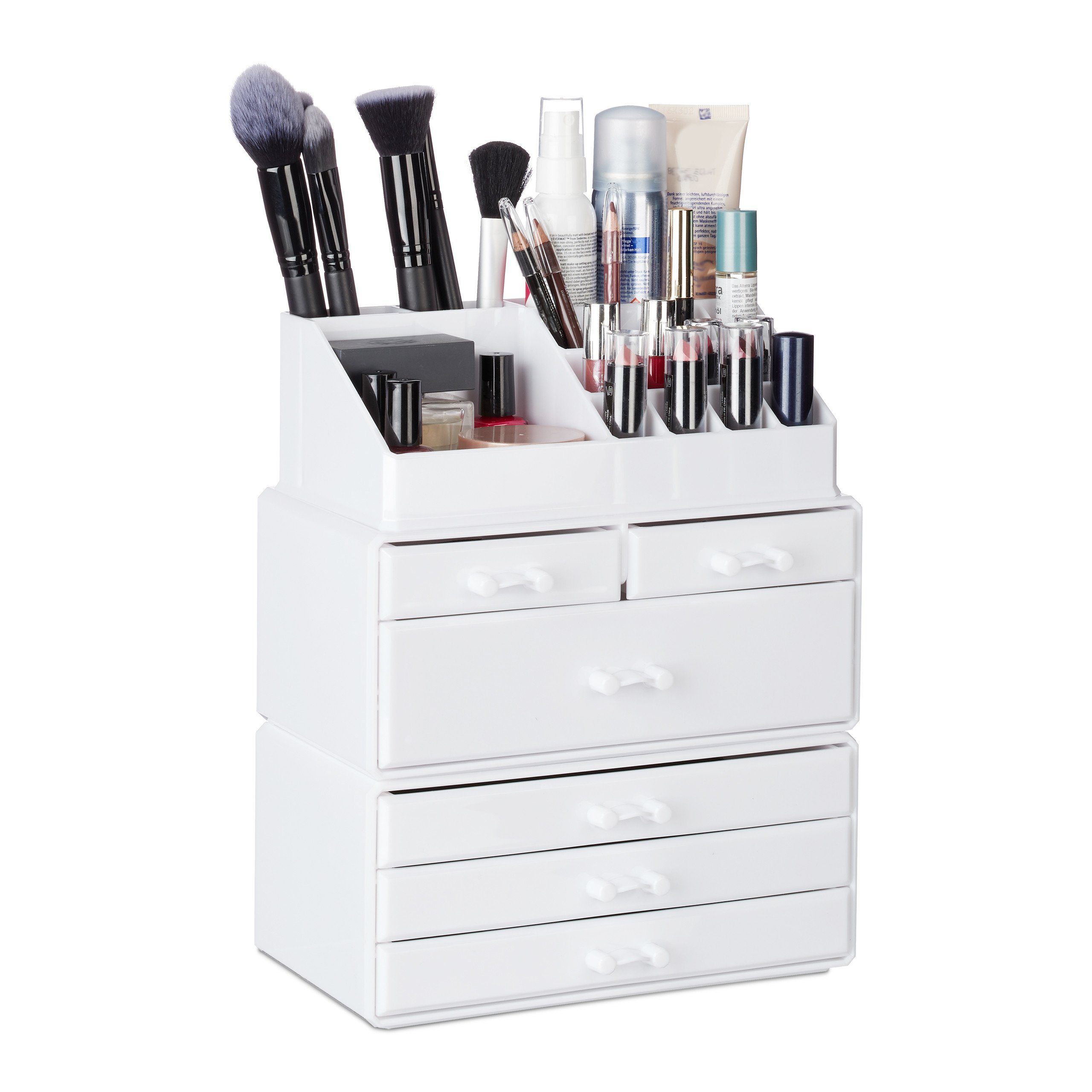 Der Kosmetikorganizer mit 6 Schubladen schafft Ordnung auf dem Schminktisch und erspart das Suchen in der Kosmetiktasche. Die dreiteilige Make Up Aufbewahrung bietet mit seinen insgesamt 22 Ablagen viel Stauraum für Kosmetikartikel, Schmuck und Accessoires. Die entnehmbaren Schubladen sind sowohl für Cremes, Puder und Lidschatten als auch für Ringe, Ketten und Armbänder geeignet. Der praktische Lippenstifttower verwahrt überdies Nagellack, Pinsel, Stifte und vieles mehr. Auch auf dem Schreibtisch oder als Aufbewahrung für Nähzeug und anderes Zubehör macht der Acryl-Organizer eine gute Figur.