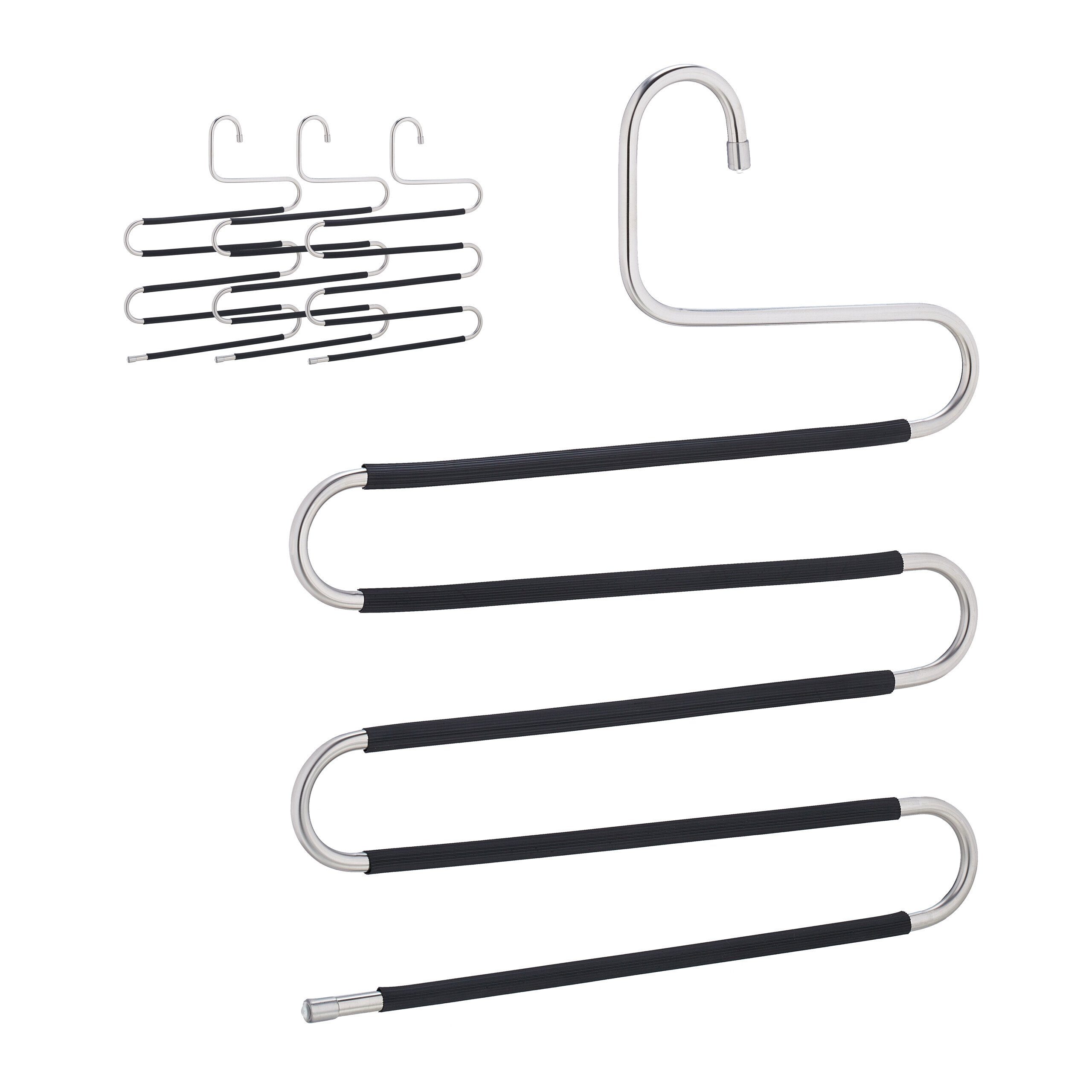 Mit diesen Hosenbügeln im 4er Set schaffst Du Ordnung und sorgst für Einheitlichkeit im Kleiderschrank. Die Kleiderbügel sorgen dank rutschfester Gummi-Schicht dafür, dass Deine Kleidung nicht herunterfällt. Auf den 5 Stangen können Hosen, Tücher oder Röcke faltenfrei aufgehängt werden. Dabei sparst Du mit den Mehrfachbügeln jede Menge Platz. Das clevere S-Design der Bügel lässt ausreichend Stauraum für die neusten Teile. Die praktischen Multibügel überzeugen mit ihrem Material- und Farbmix.