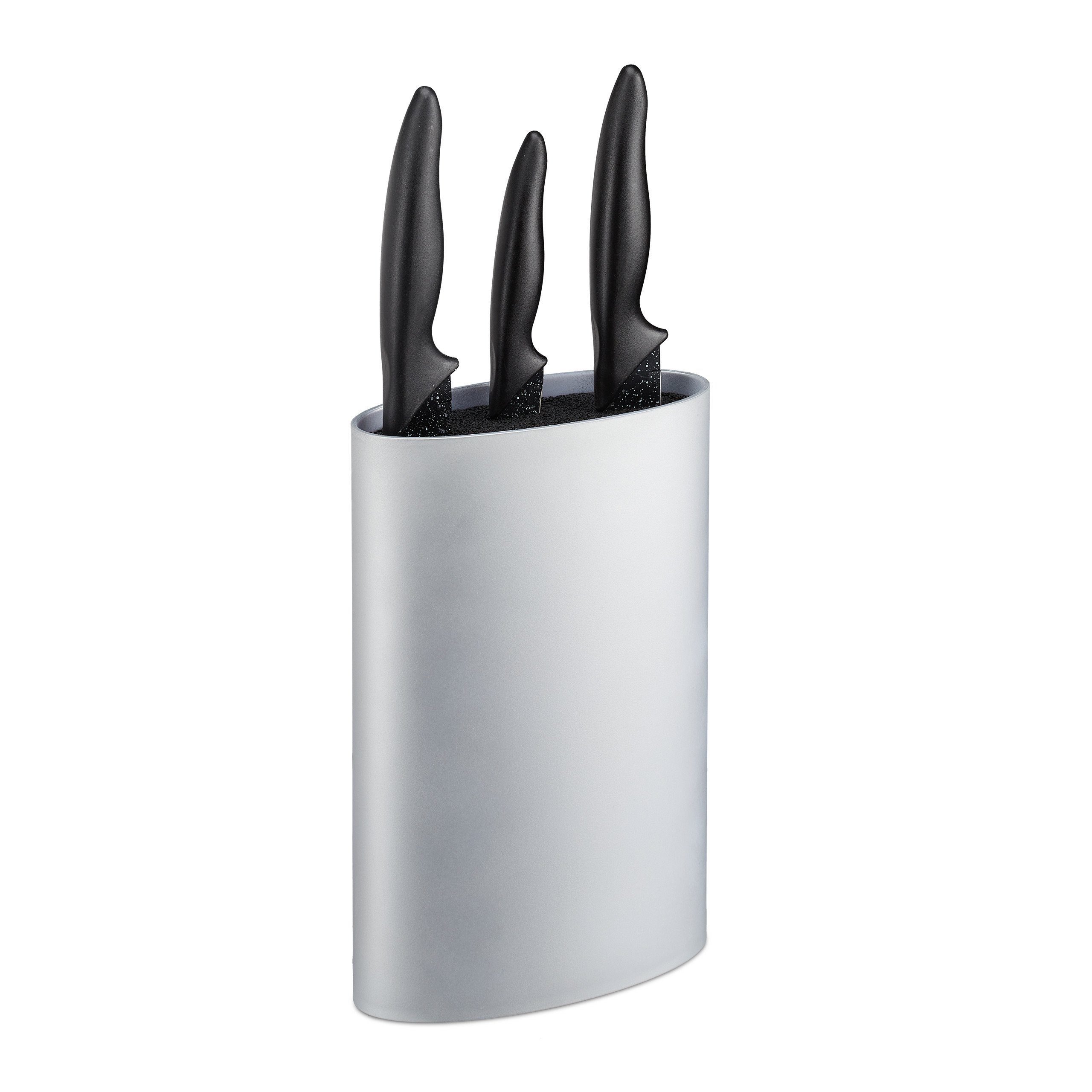Der unbestückte Messerblock ist ein nützliches Küchenutensil für alle Hobbyköche. Der Messerhalter besteht aus einem ovalen Kunststoffbehälter mit herausnehmbaren Borsteneinsatz. Dieser hält Ihre Küchenmesser sicher und die Klingen geschützt. Der Einsatz aus flexiblen Kunststoffborsten ermöglicht eine individuelle Nutzung des Universalblocks. Mit seiner matten Optik passt der Messerständer gut in moderne Küchen fügt sich dank seiner Schlichtheit aber auch problemlos in andere Einrichtungen.
