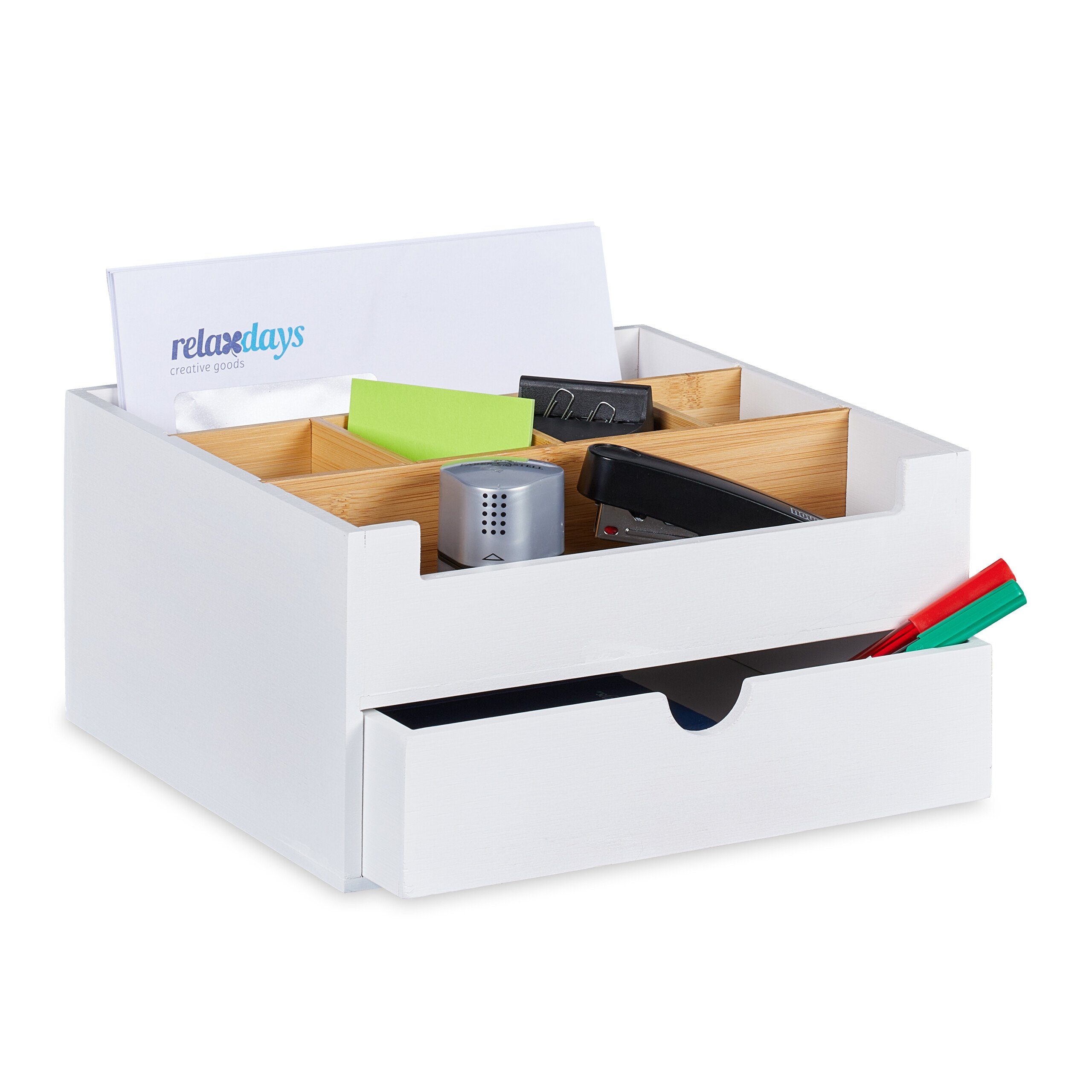 Büro-Organizer im Detail - Gesamtmaße H x B x T: ca. 13 x 26 x 23,5 cm - Innenmaße große Fächer (2) H x B x T: ca. 6 x 24,5 x 7 cm - Innenmaße kleine Fächer (4) H x B x T: ca. 6 x 5,5 x 7,5 cm - Innenmaße Schublade H x B x T: ca. 5 x 23 x 21,5 cm - Gewicht: ca. 1,4 kg - Material: Bambus - Farbe: Weiß, Natur Moderne Schreibtischablage aus Bambus - 1 geräumige Schublade und 6 Fächer zur Aufbewahrung - Organizer für Bürobedarf wie Stifte, Notiz- und Klebezettel - Ideal für Schreibtische im Home-Office oder im Büro - Perfekt auch im Bad für Lippenstifte, Nagellack & Co. - Weißer Look kombiniert mit natürlichen Akzenten - Trennwände können flexibel angeordnet werden