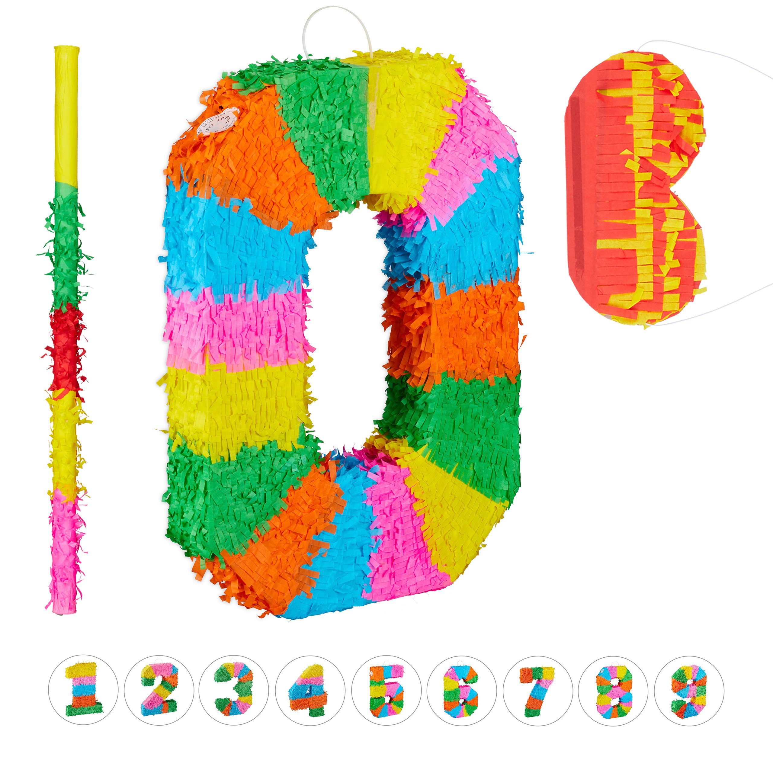 3 tlg. Pinata Set: Enthält eine bunte Zahlenpinata in Form einer Null sowie Stab und Augenmaske