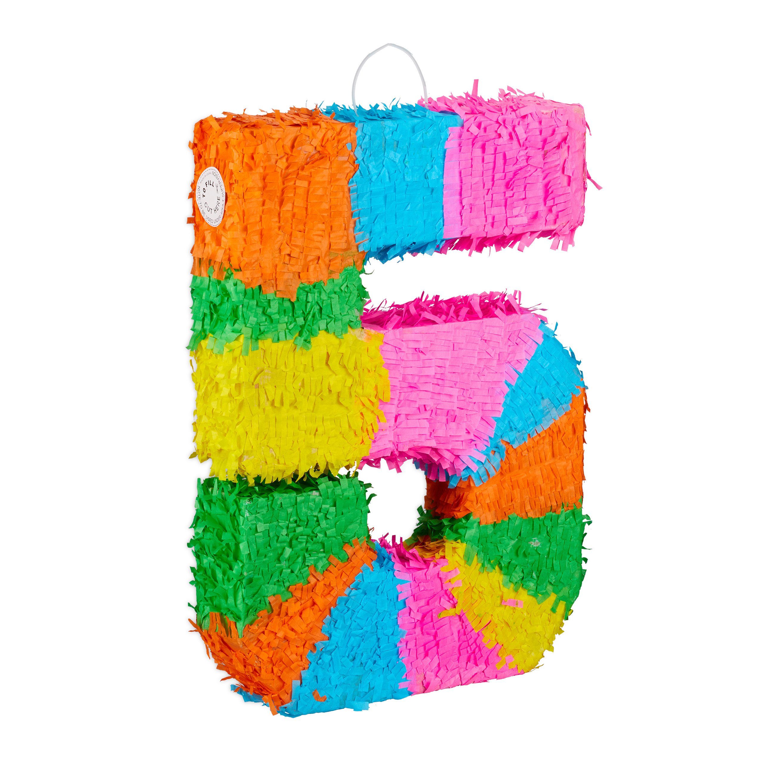 Pinata Zahl im Detail - Maße H x B x T: ca. 50,5 x 35,5 x 7,5 cm - Gewicht: ca. 0,2 kg - Material: Papier - Farbe: Bunt - Zahl 5