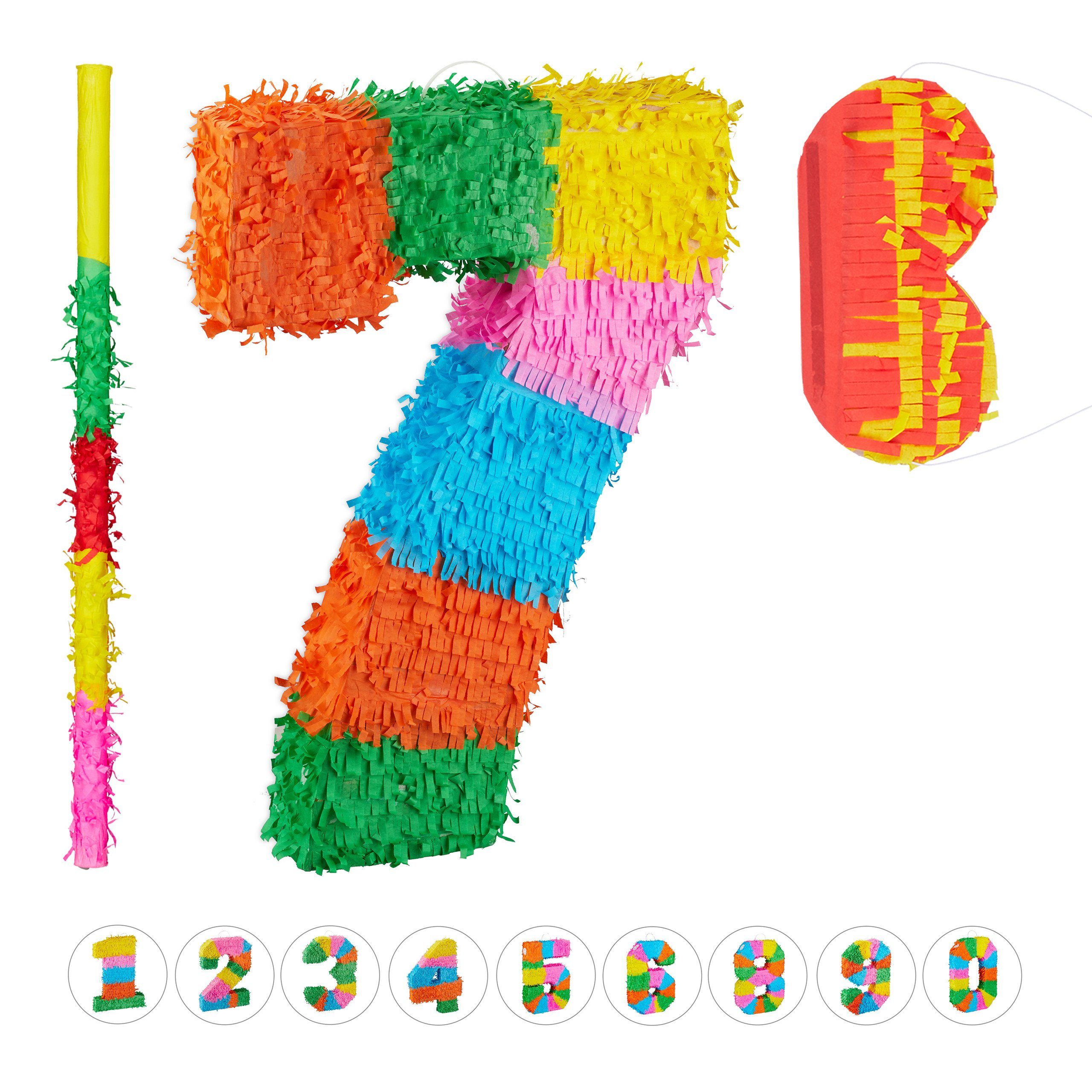 3 tlg. Pinata Set: Enthält eine bunte Zahlenpinata in Form einer Sieben sowie Stab und Augenmaske