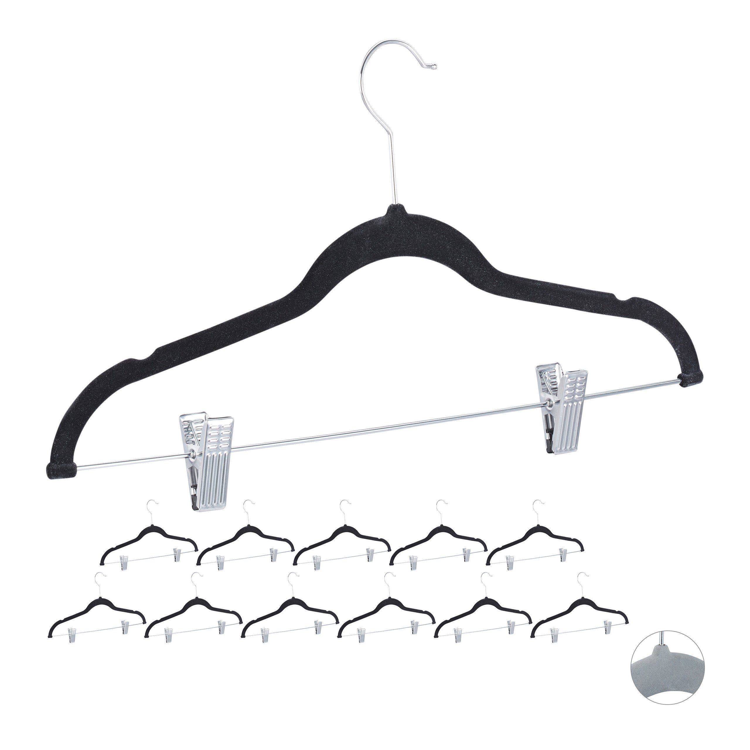 Samtbügel mit Clips im Detail - Maße H x B x T: ca. 22,5 x 43 x 2,8 cm - Materialien: Metall, Samt - Gewicht: ca. 95 g - Farbe: Schwarz