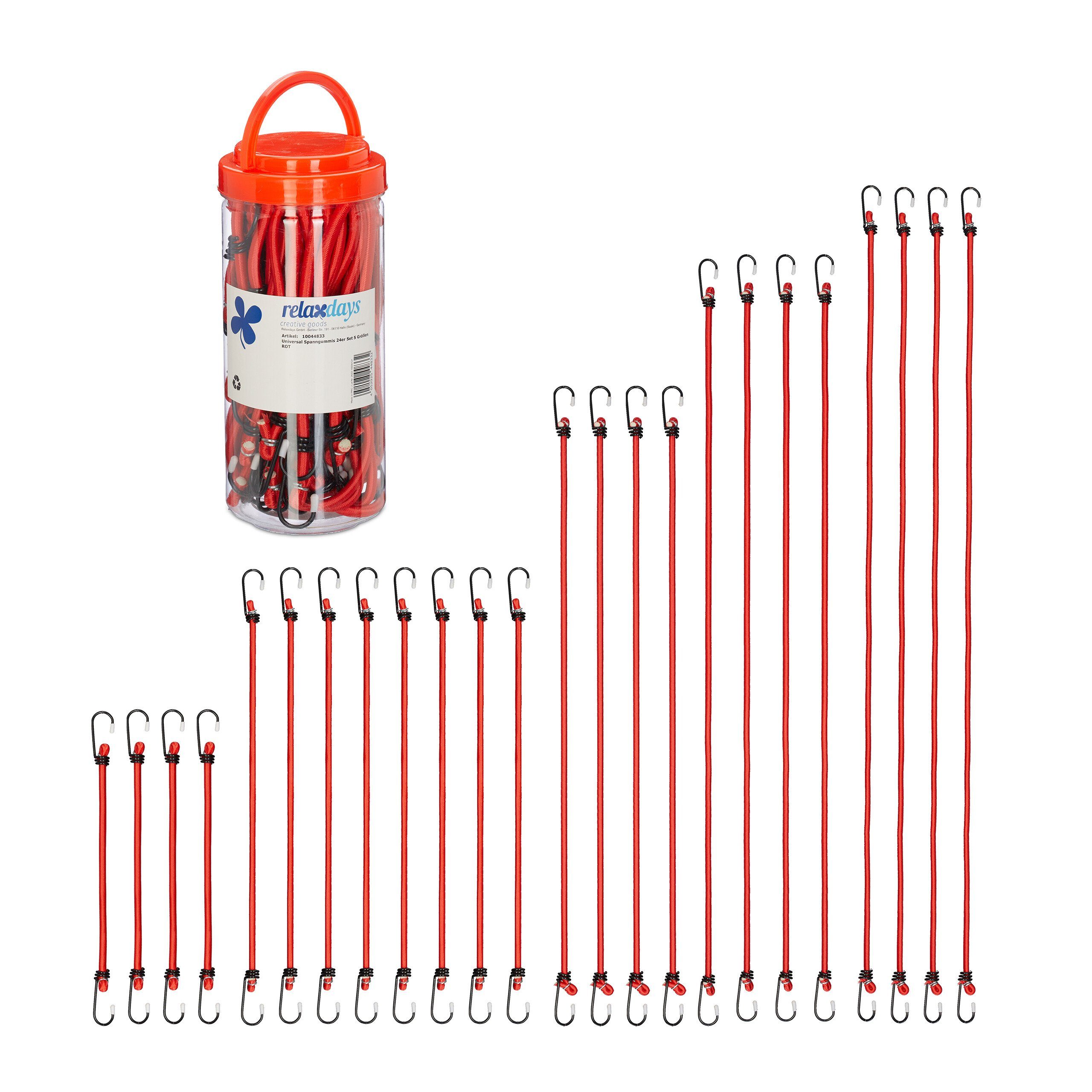 Spanngummis im Detail im 48er Set - 48x Spanner mit je ca. 93 cm Длина - 48x Spanner mit je ca. 82 cm Длина - 48x Spanner mit je ca. 63 cm Длина - 96x Spanner mit je ca. 44 cm Длина - 48x Spanner mit je ca. 31 cm Длина - Seildurchmesser: ca. 0,6 cm - Gesamtgewicht Set mit Box: ca. 1,3 kg (pro 24er Set) - Material: PP, Gummi, Eisen - Farbe: Rot