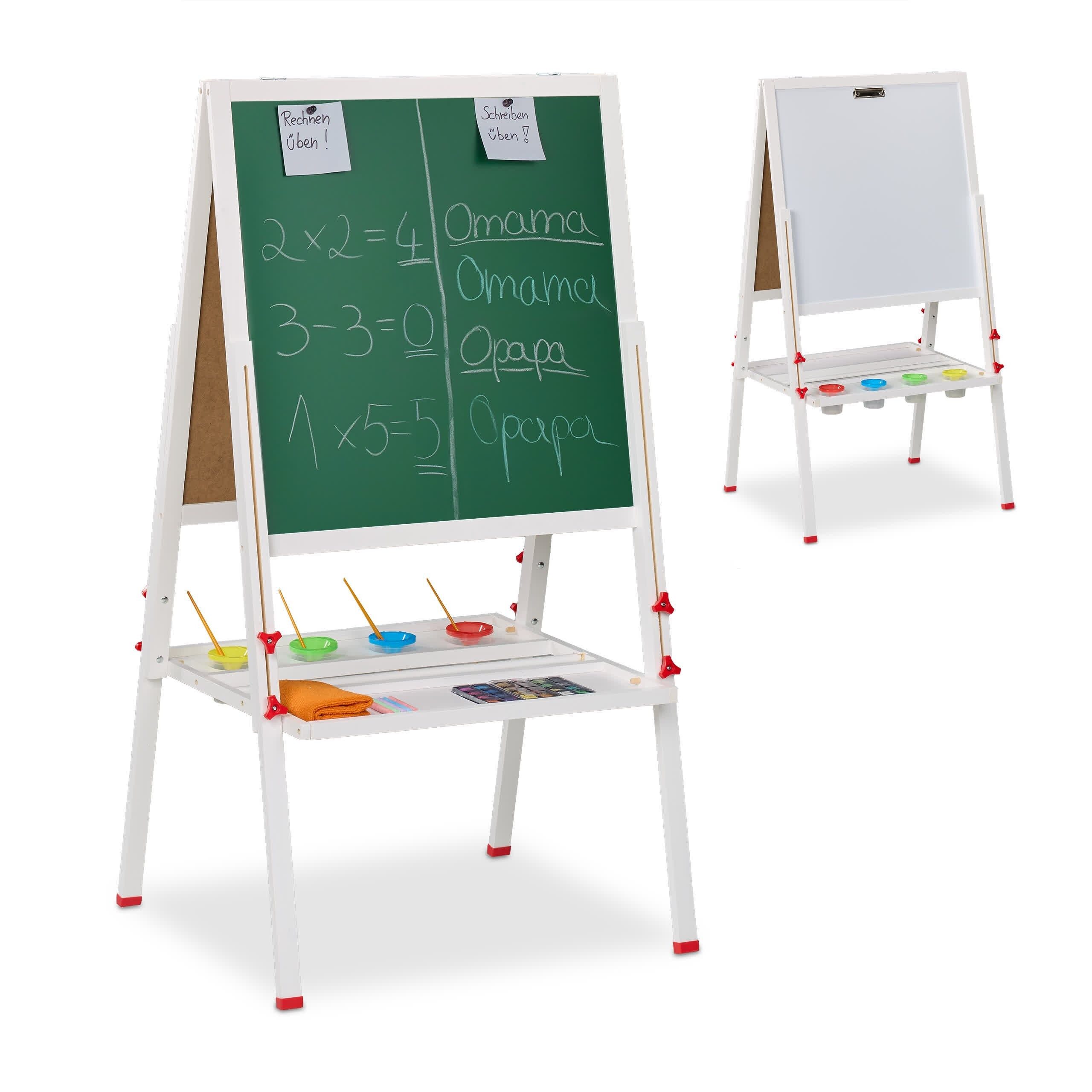 Diese Kindertafel ist die ideale Ergänzung für das Kinderzimmer. An ihr lässt sich spielen, malen und das Rechnen oder Buchstabieren lernen. So können Deine Kleinen ihre Kreativität spielerisch an der magnetischen Standtafel ausleben. Die Tafel hat 2 Seiten mit einem Whiteboard und einer Kreidetafel, die mit Markern und Kreide verziert werden können. Durch Schienen kann die Holztafel stufenlos in der Höhe verstellt werden. Eine praktische Ablagefläche sowie 4 Becher runden die Tafel ab.