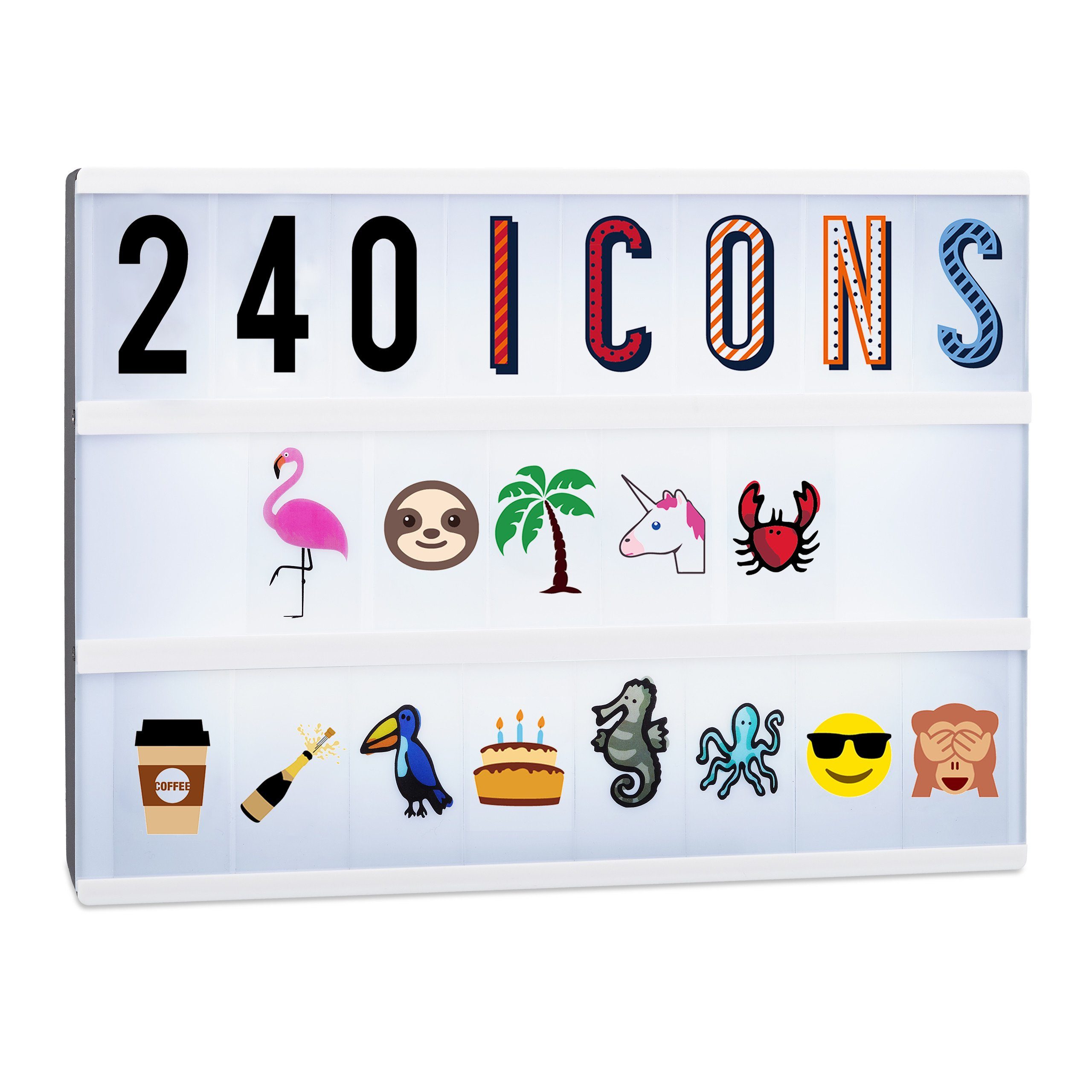 Teilen Sie Ihre persönliche Botschaft mit der Welt mit dem Lightbox Ergänzungsset aus 240 Zeichen. Die stabilen Kärtchen passen in jede handelsübliche Lichtbox und erweitern mit Buchstaben, Zahlen und lustigen Gesichtern Ihren kreativen Spielraum. Die umfangreiche Kollektion ist das ideale Leuchtkasten-Zubehör auf Geburtstagen und Hochzeiten. Auch der Alltag wird mit den Plättchen bereichert. Nutzen Sie die facettenreichen Emotion-Icons als Stimmungsbarometer, geben Sie einem Memo mit farbigen Sonderzeichen mehr Ausdruckskraft oder kreieren Sie sich Ihre eigene Wettervorhersage mit den Bildmotiven für Sonne, Wolken und Regen.