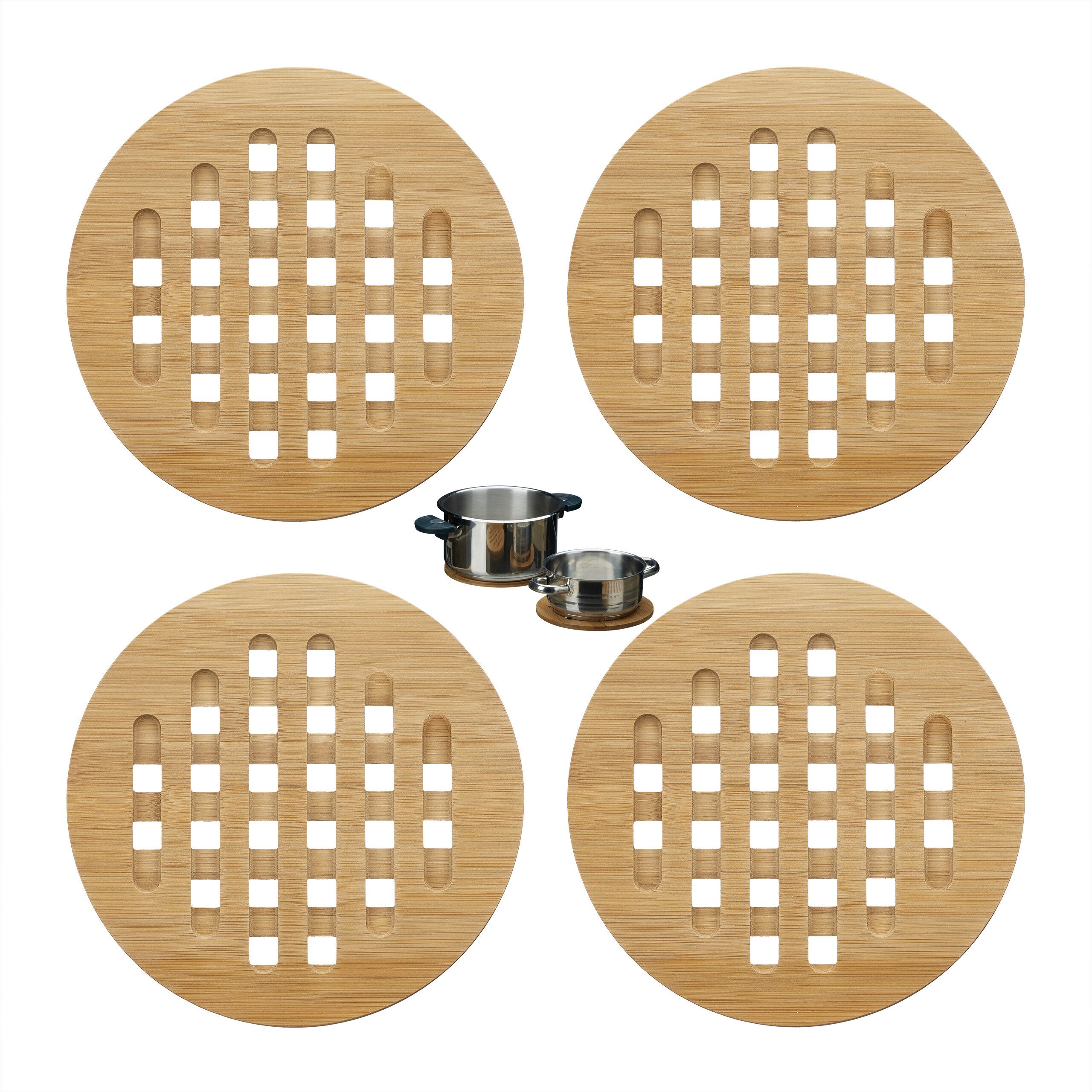 Schützen Sie Ihre Arbeitsplatten in der Küche vor unschönen Brandflecken! Mit diesem 4er Set robuster Topfuntersetzer stellen Sie beim Kochen Töpfe, Pfannen, Schüsseln, Auflaufformen und Co. zukünftig sicher ab. Auch heiße Teller, Tassen und Teekannen können Sie so gefahrlos auf Ihrem empfindlichen Ess- und Schreibtischen platzieren, ohne Kratzer zu riskieren. Die Untersetzer sind aus natürlichem Bambusholz gefertigt - einem schnell nachwachsenden und daher besonders umweltfreundlichen Material, das zudem extrem hart und robust ist. Die Oberfläche ist lackiert und so auch bei Verschmutzung leicht abwischbar.