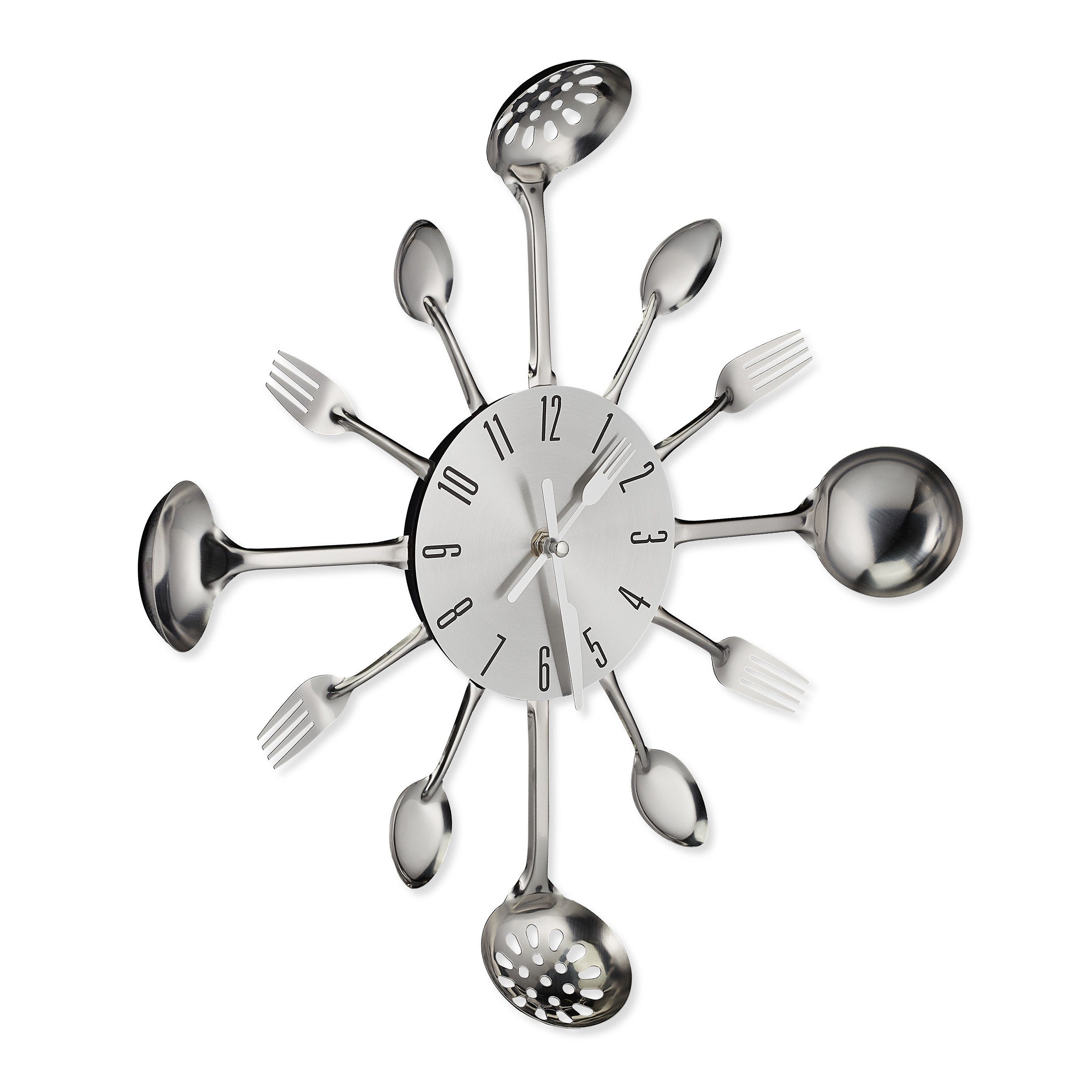Mit dieser Besteckuhr holen Sie sich einen ausgefallenen Eyecatcher an Ihre Wand und behalten die Uhrzeit stets genau im Blick. Dafür ist die originelle Essensuhr mit einem Minuten- und Stundenzeiger in Form von einer kleinen Gabel und einem Messer ausgestattet. Die vollen Stunden werden von Löffeln, Kellen und Gabeln, die rings um das Ziffernblatt angeordnet sind, markiert. Vor allem in Küche und Esszimmer ist die Uhr eine tolle Wanddeko, aber auch im Restaurant wird sie zum modernen Hingucker.
